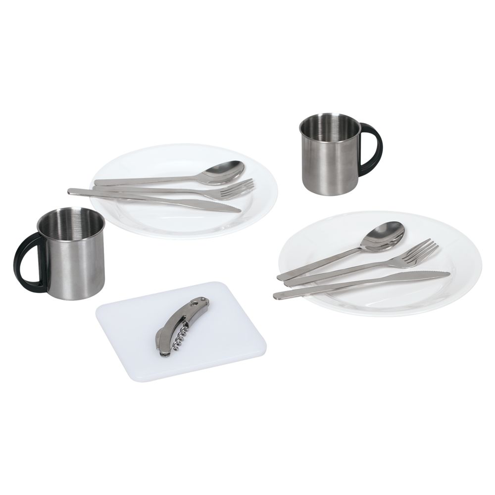 рюкзак - полиэстер; приборы и кружки - нержавеющая сталь; тарелки и разделочная доска - пластик
