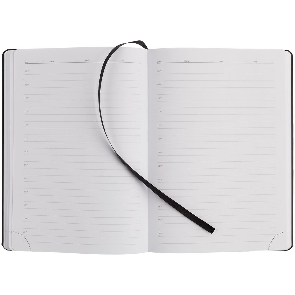 Ежедневник с твердой обложкой, выполнен из материала Brand, черный АА, дополнен ляссе в цвет обложки.