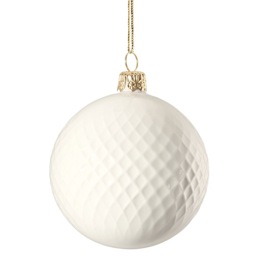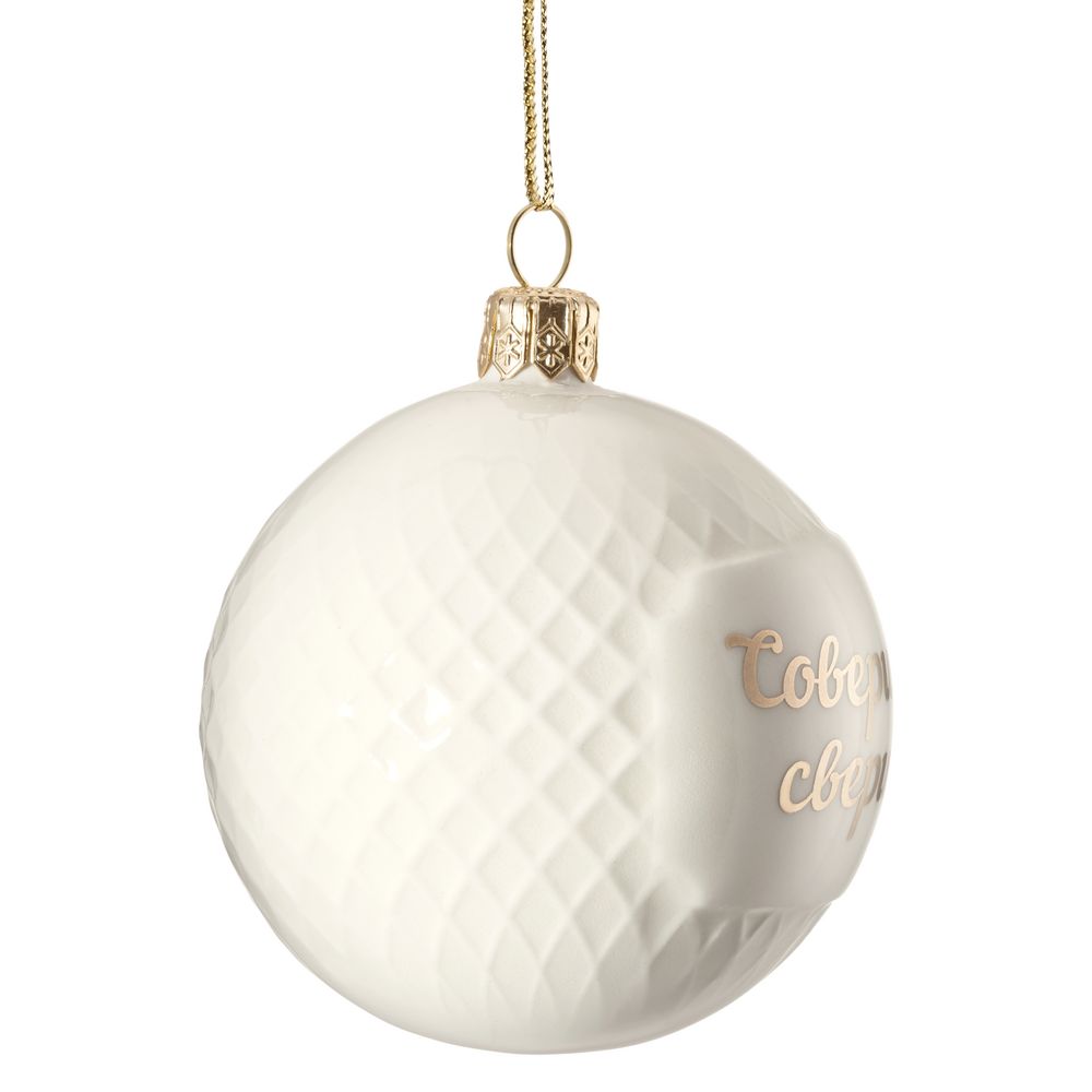 Фарфоровый молочный шар с рельефным узором и запоминающейся надписью дополнит коллекцию символичных елочных игрушек и сохранит память о его дарителе и самом волшебном празднике в году.