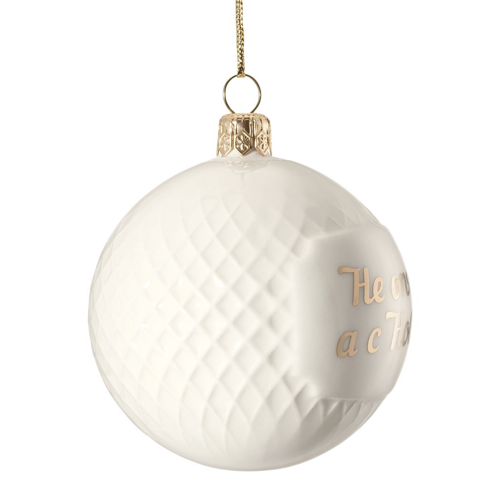 Фарфоровый молочный шар с рельефным узором и запоминающейся надписью дополнит коллекцию символичных елочных игрушек и сохранит память о его дарителе и самом волшебном празднике в году.