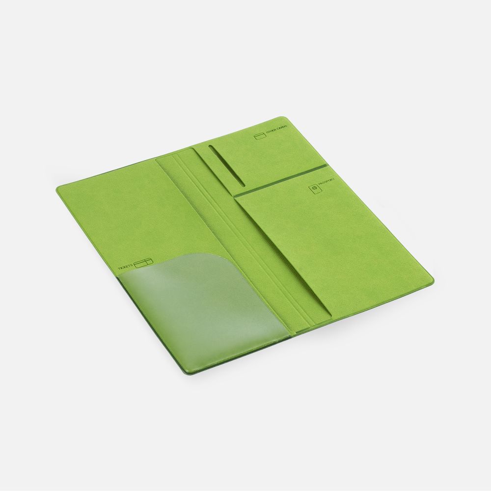 Органайзер из искусственного материала, имитирующего сафьяновую кожу, имеет 5 отделений: для билетов, паспорта, визиток или кредитных карт.