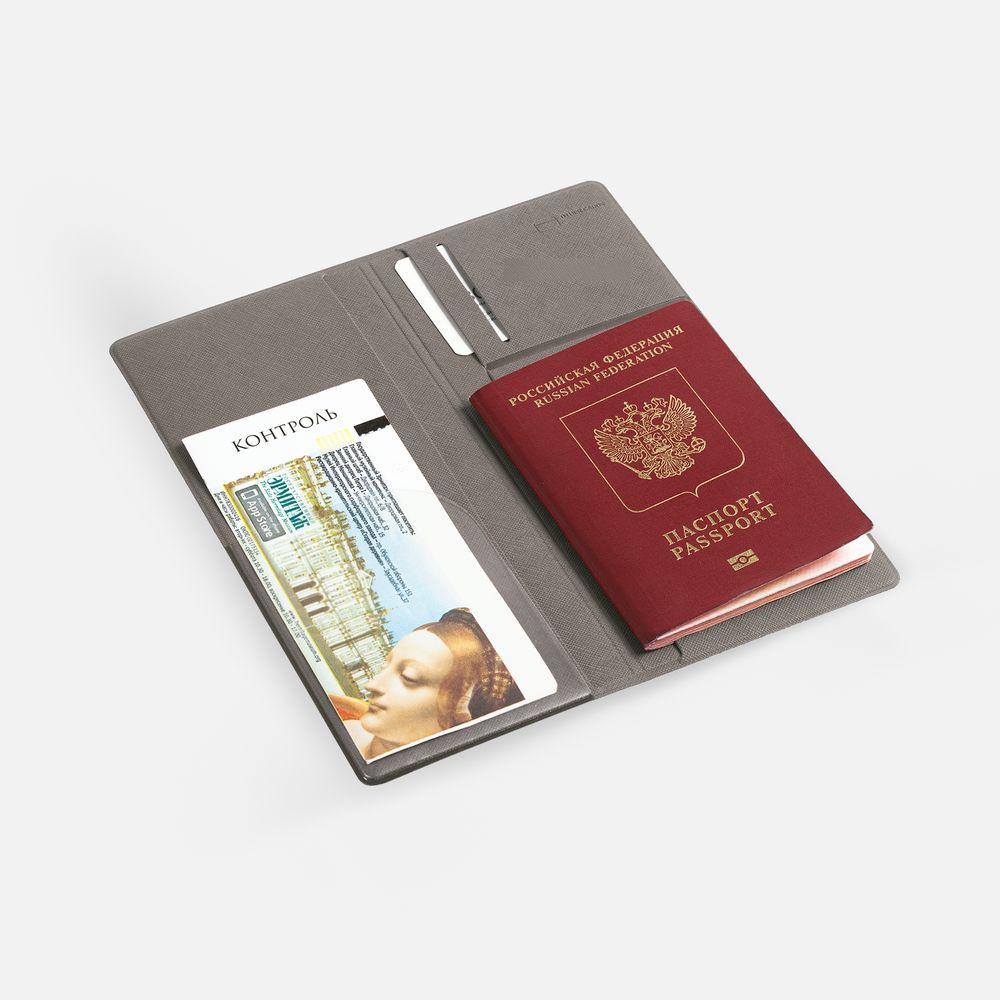 Органайзер из искусственного материала, имитирующего сафьяновую кожу, имеет 5 отделений: для билетов, паспорта, визиток или кредитных карт.