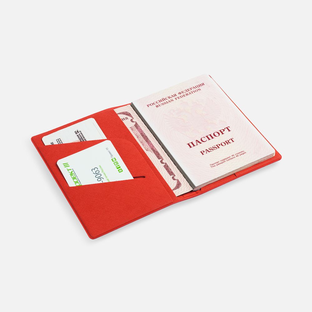 Обложка из искусственного материала, имитирующего сафьяновую кожу, с дополнительными карманами для визиток, полиса ОМС или записок.