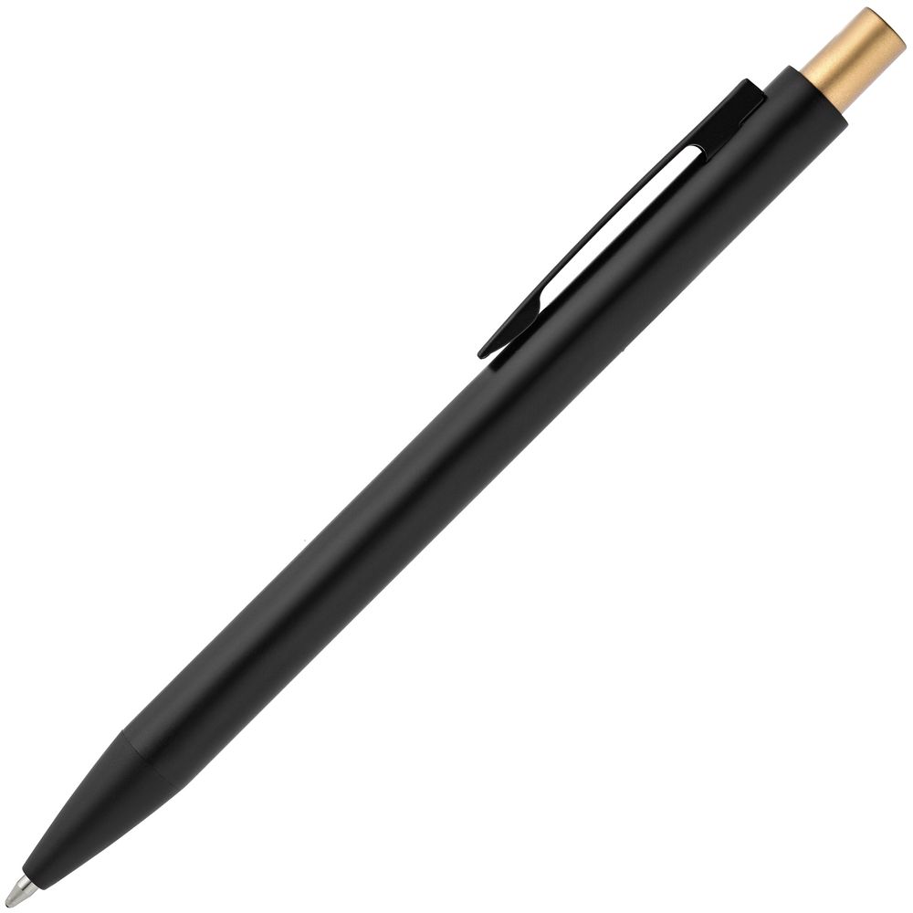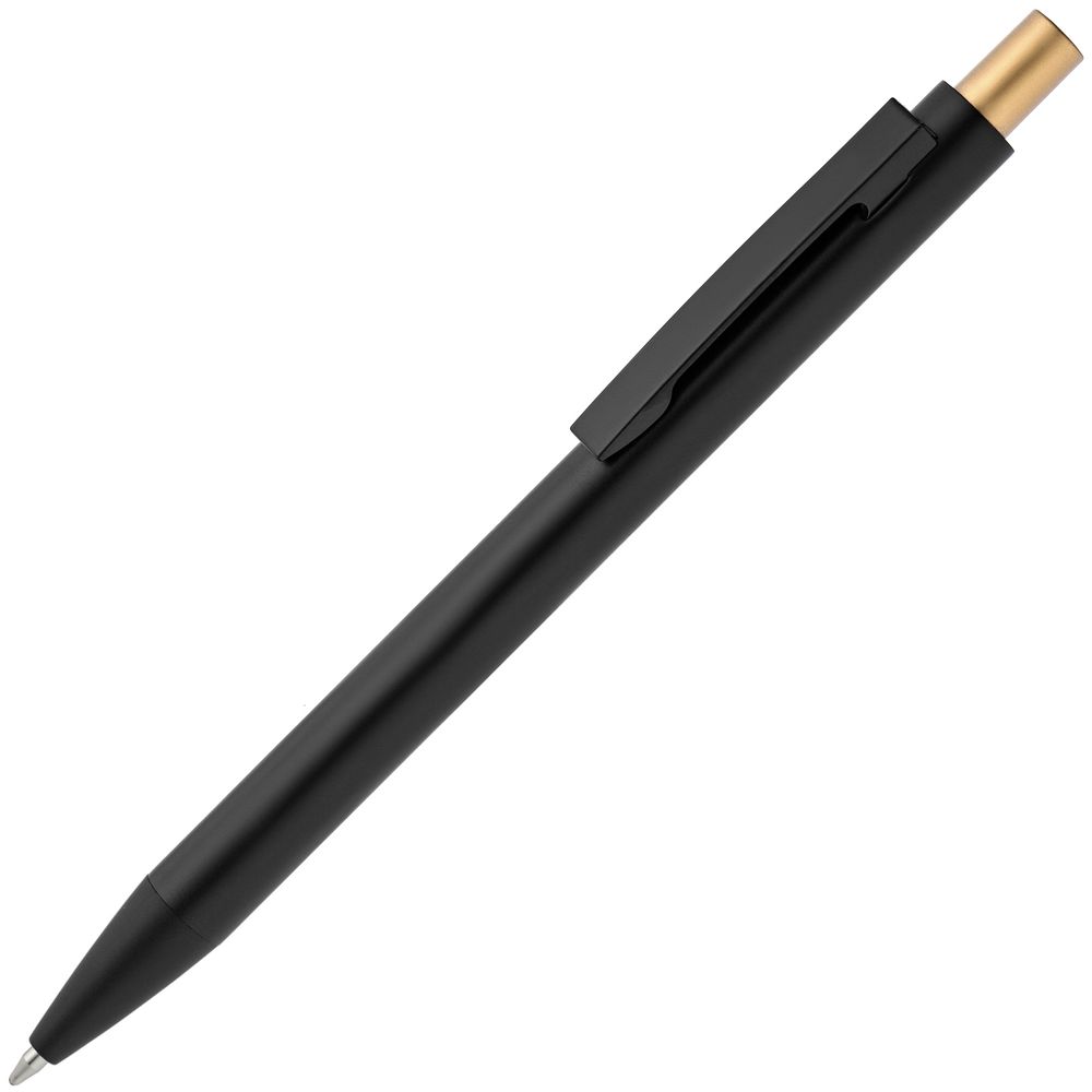 Ручка строгих форм в черном корпусе с цветными деталями.