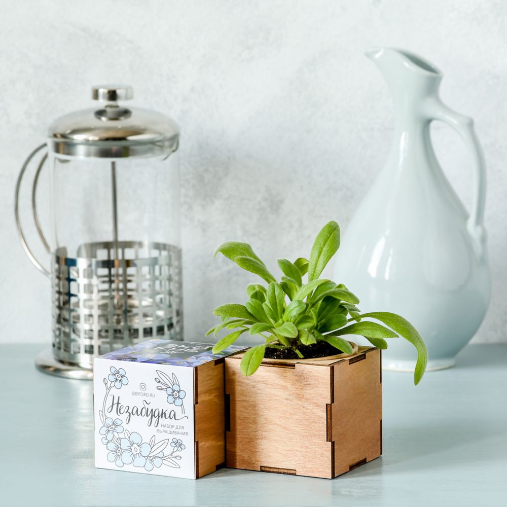 В наборе: деревянный куб, бумажный стаканчик, питательный грунт, семена, вермикулит.
