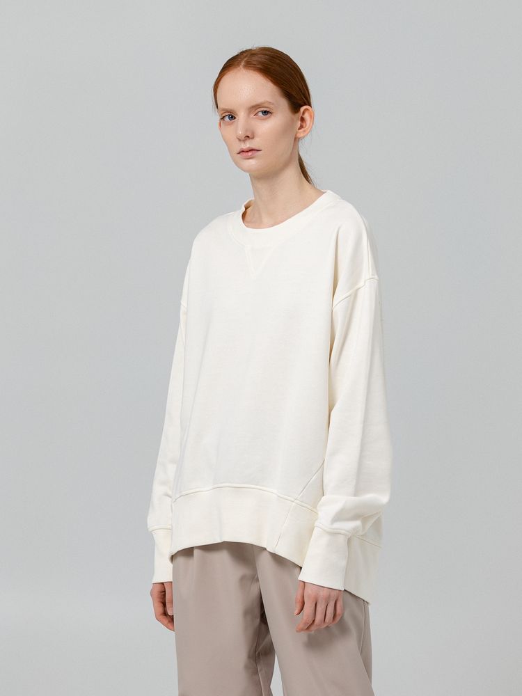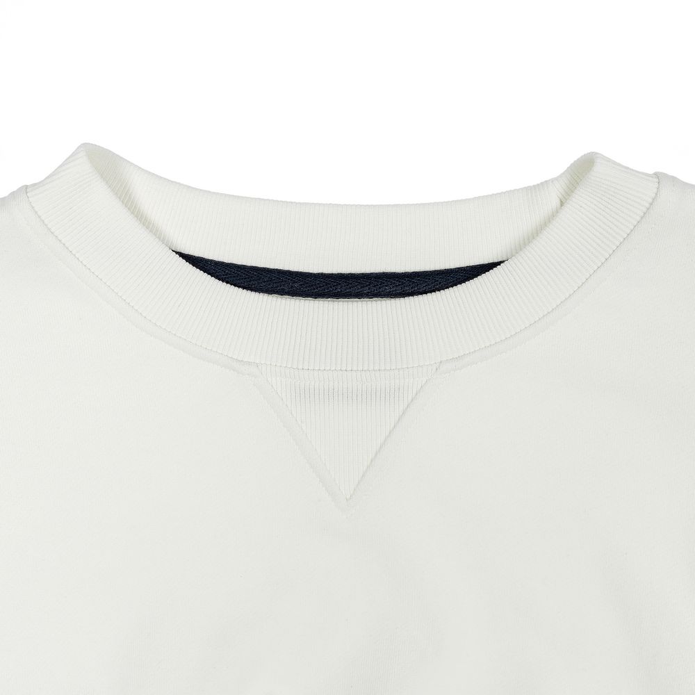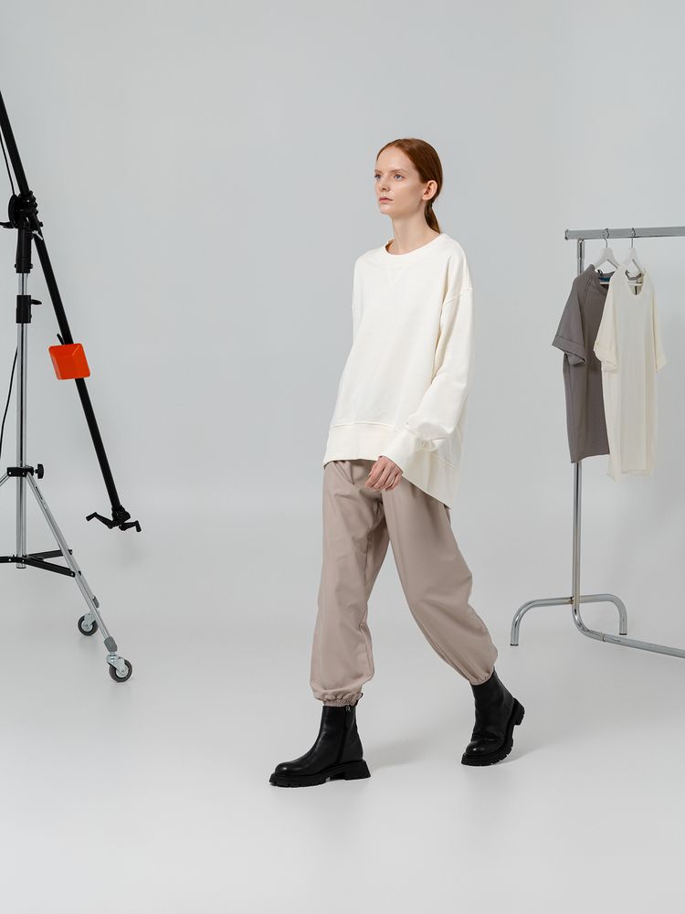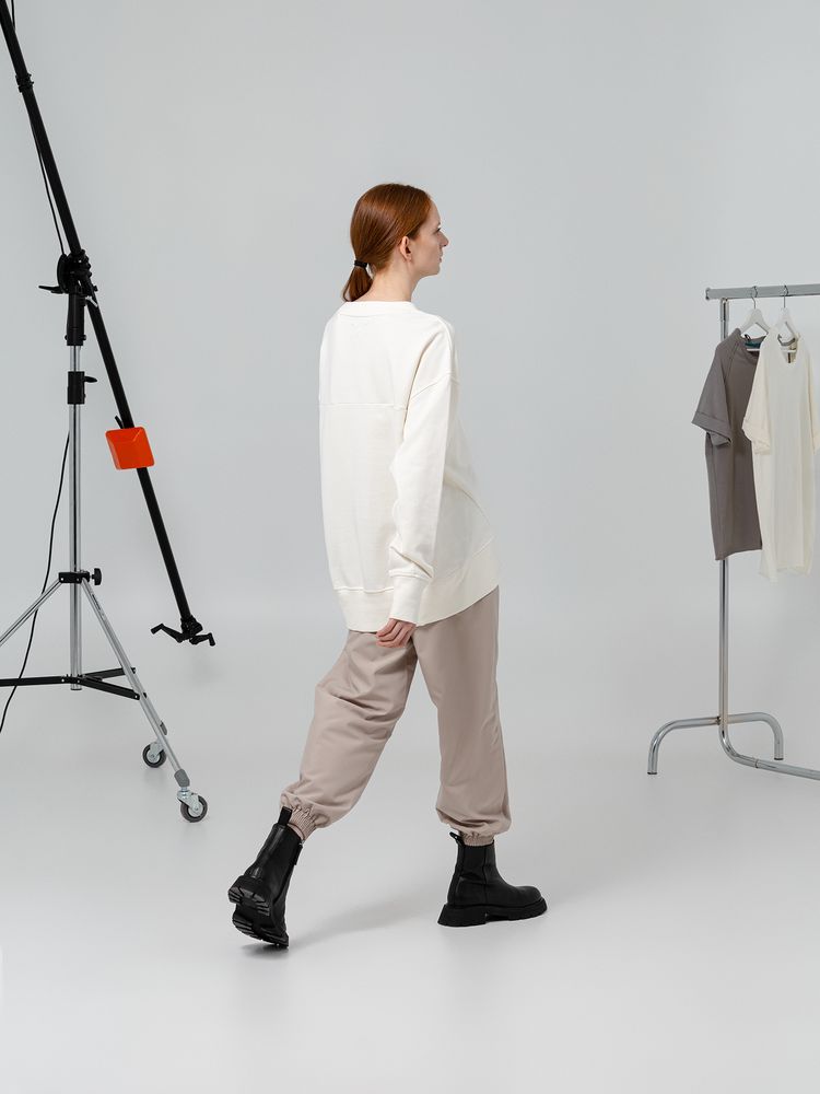 Свитшот унисекс свободного кроя со спущенным плечом и смещенным боковым швом. Внутренняя сторона без начеса.