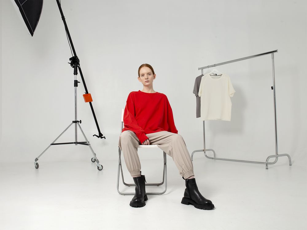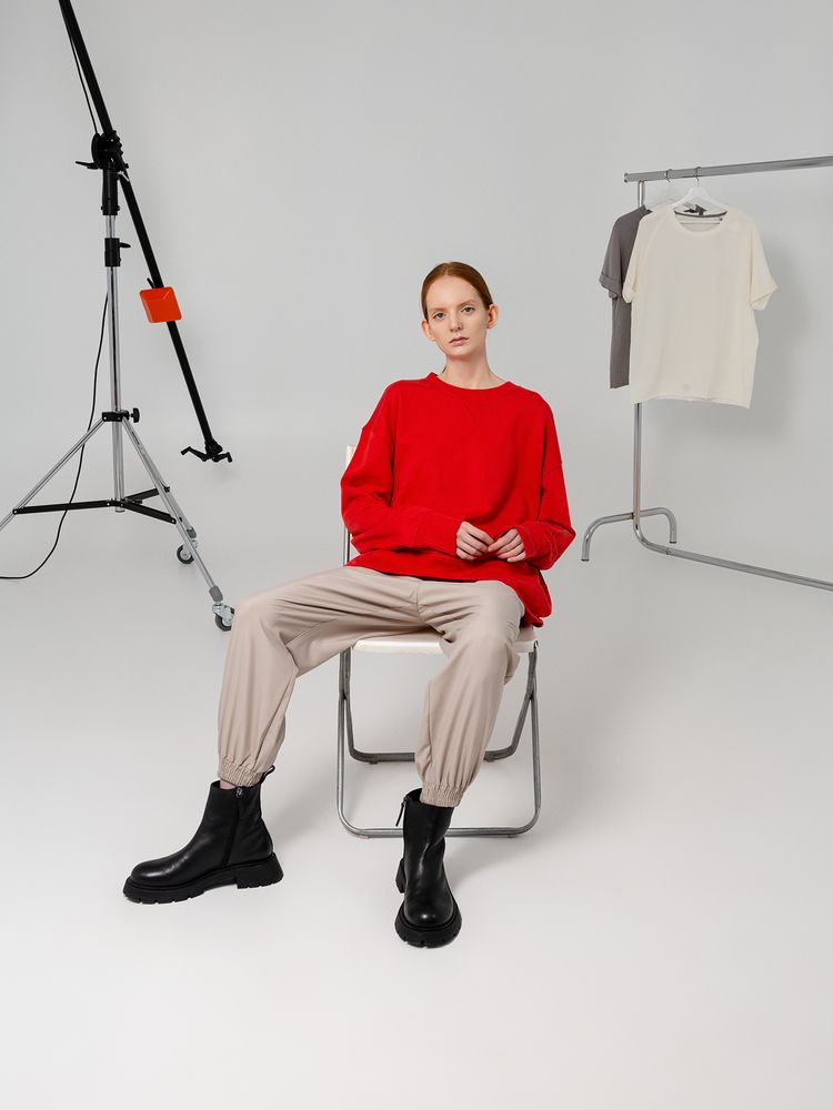 Свитшот унисекс свободного кроя со спущенным плечом и смещенным боковым швом. Внутренняя сторона без начеса.