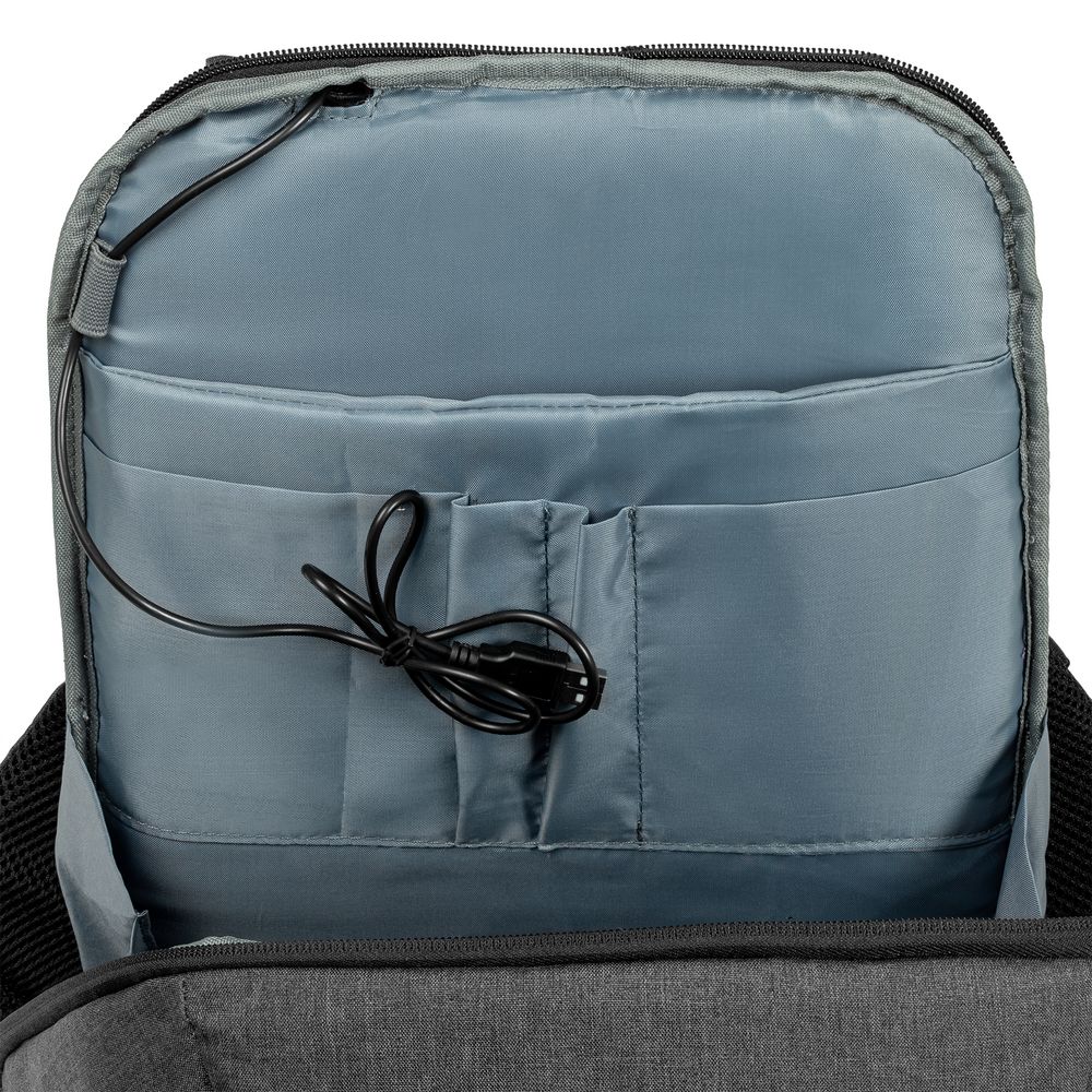- Внешний USB-порт для зарядки гаджетов (внутри рюкзака — провод для подключения и карман для размещения аккумулятора)