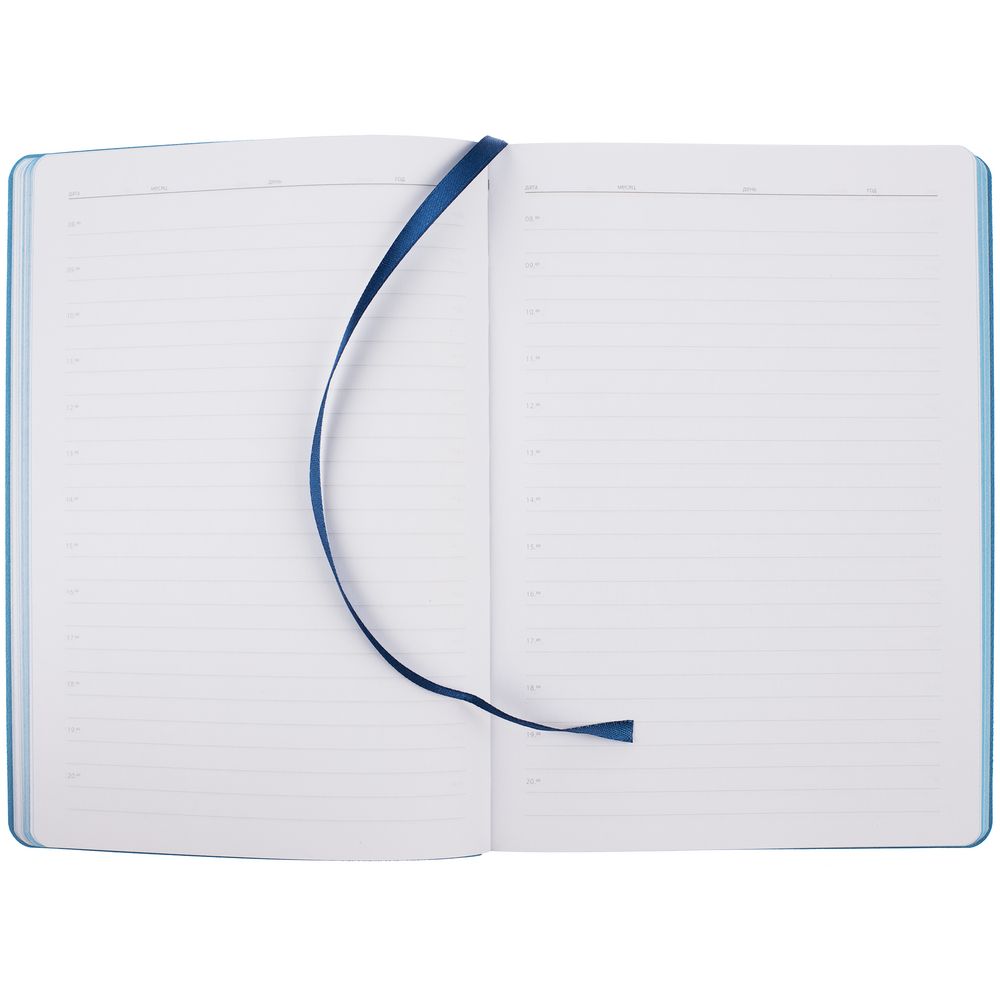 Ежедневник с гибкой обложкой, выполнен из материала Vintage, темно-синий НН и Latte, голубой JJ, дополнен ляссе в цвет обложки.