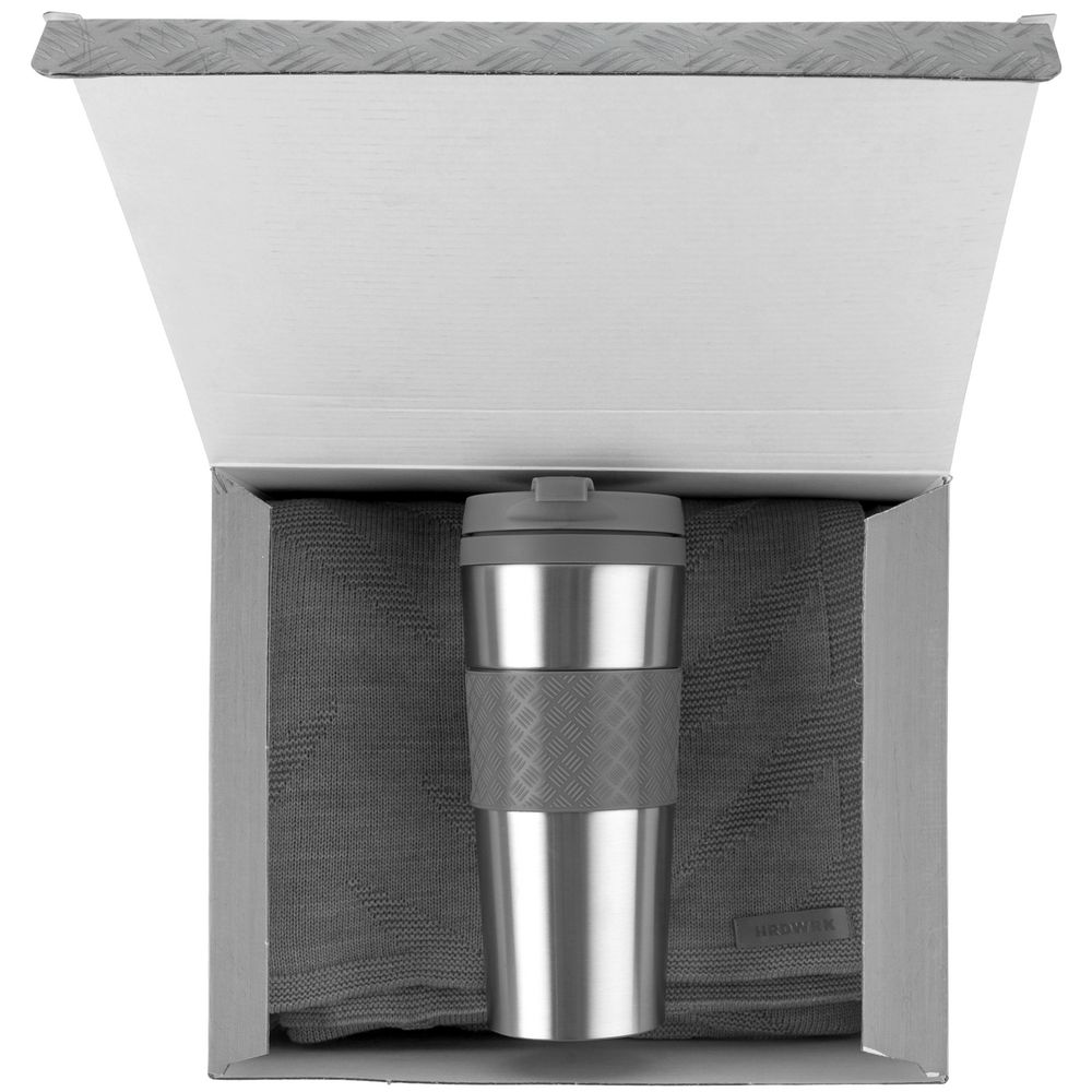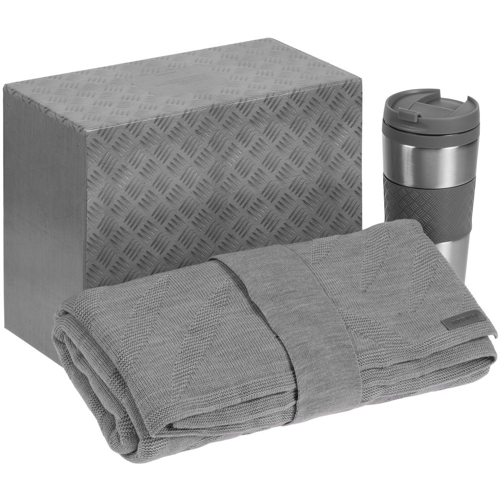 термостакан - металл, пластик, силикон; плед - акрил; коробка - микрогофрокартон, плотность 240 г/м²; полноцветный лайнер