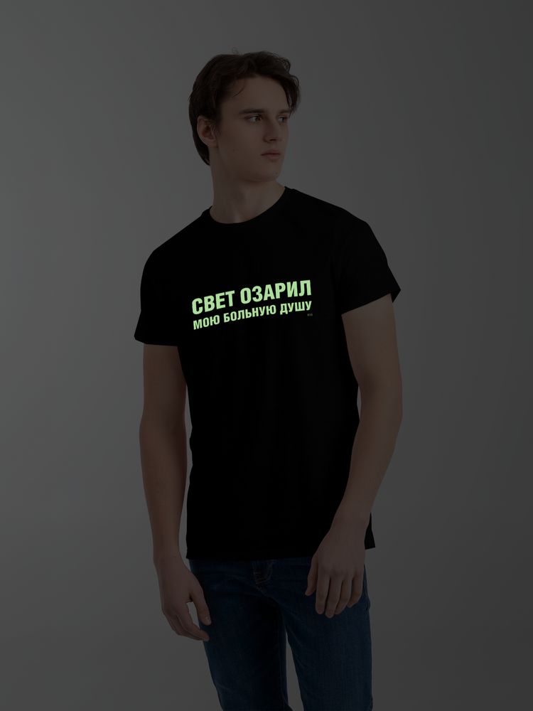 Когда душа поет, когда переполняют чувства, не держите это в себе! Пусть все видят, как вы светитесь. Особенно эффектно — в темноте. Потому что принт на футболке выполнен светонакопительной краской и передает эмоции на все 111%.