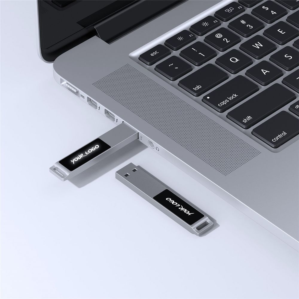 Флешка в тонком металлическом корпусе с пластиковой самоклеящейся шильдой в комплекте. Благодаря встроенной в корпус светодиодной матрице, логотип, выполненный на шильде методом лазерной гравировки, подсвечивается белым, красным, зеленым или синим в зависимости от выбранной модели.