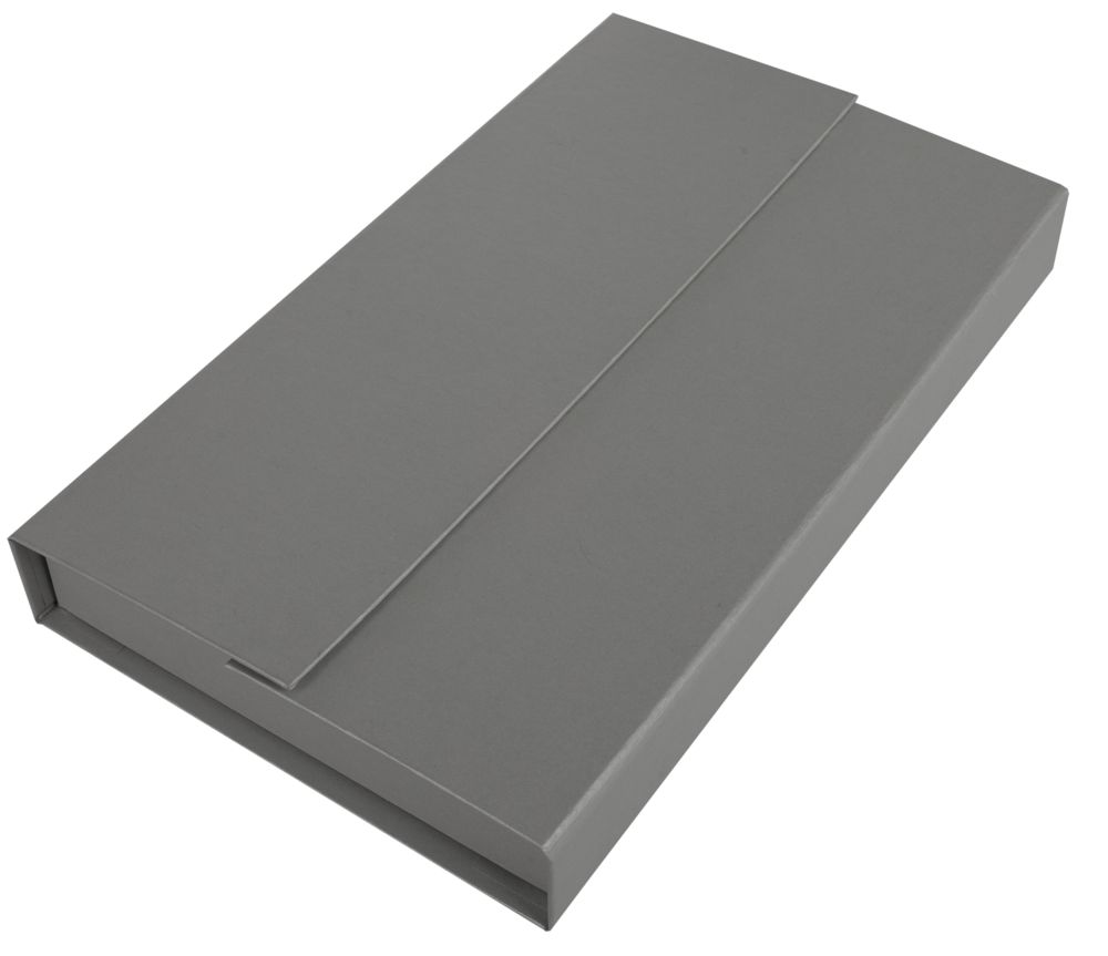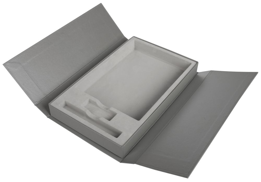 Коробка из переплетного картона, кашированного бумагой Malmero, с двумя створками на магните и флокированным ложементом.