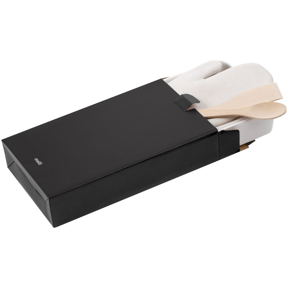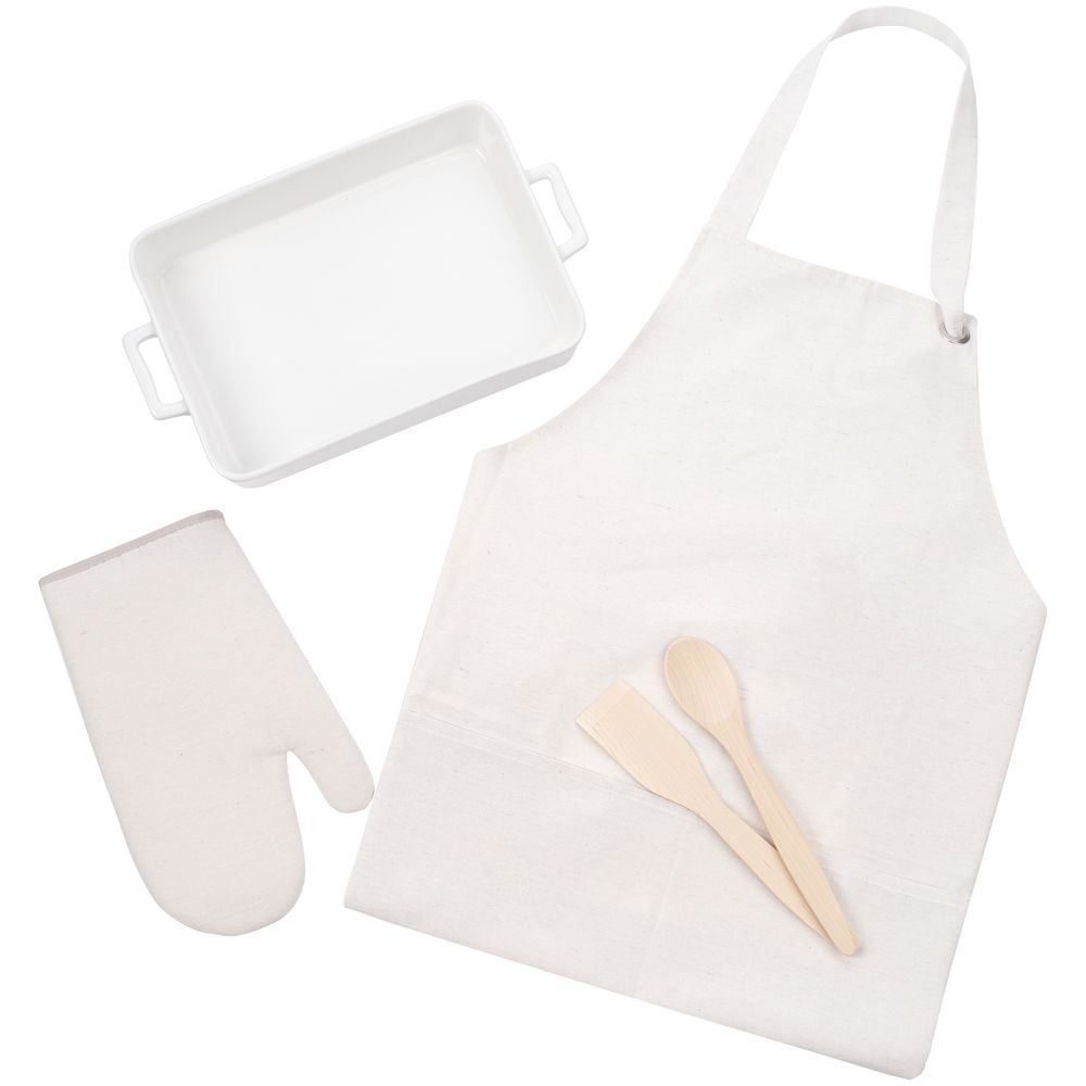 фартук, прихватка-рукавица - хлопок 70%, полиэстер 30%; форма для запекания - фарфор; лопатка, ложка - дерево