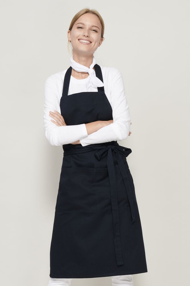 Стильный фартук из органического хлопка с большим двойным карманом спереди и регулируемой лямкой. Длина лямки регулируется пуговицей.