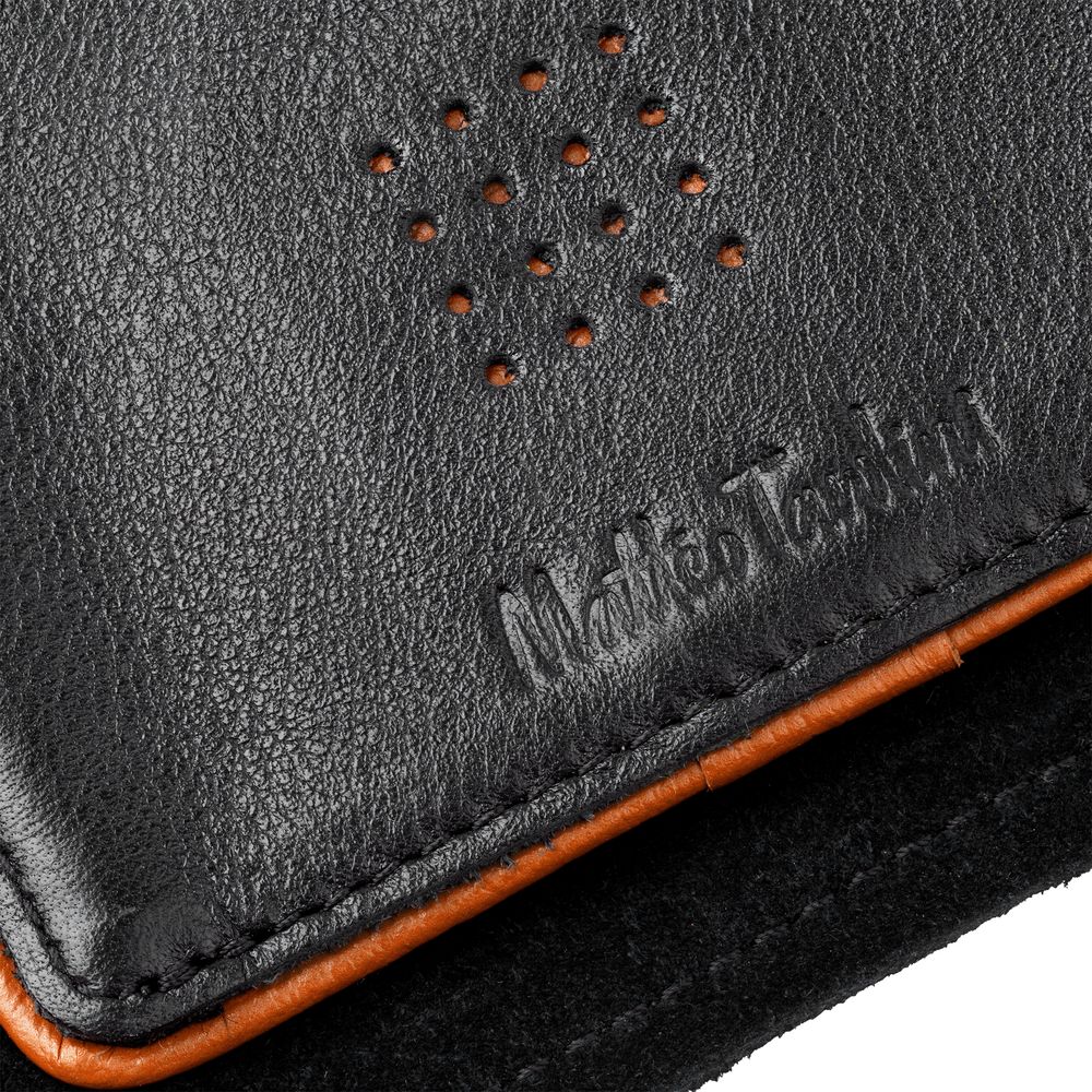 Натуральная кожа глубокого черного цвета и яркая контрастная окантовка — как страстная южная натура, сдержанная рамками условных приличий.