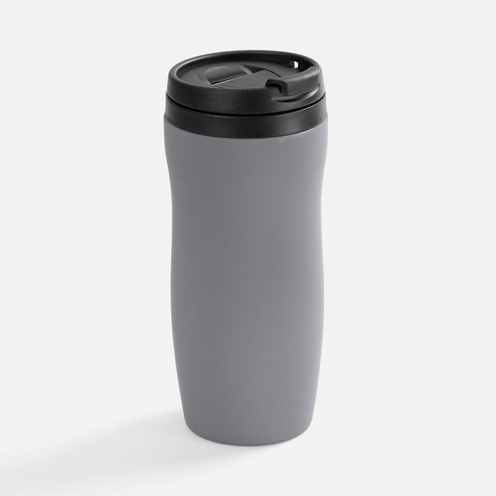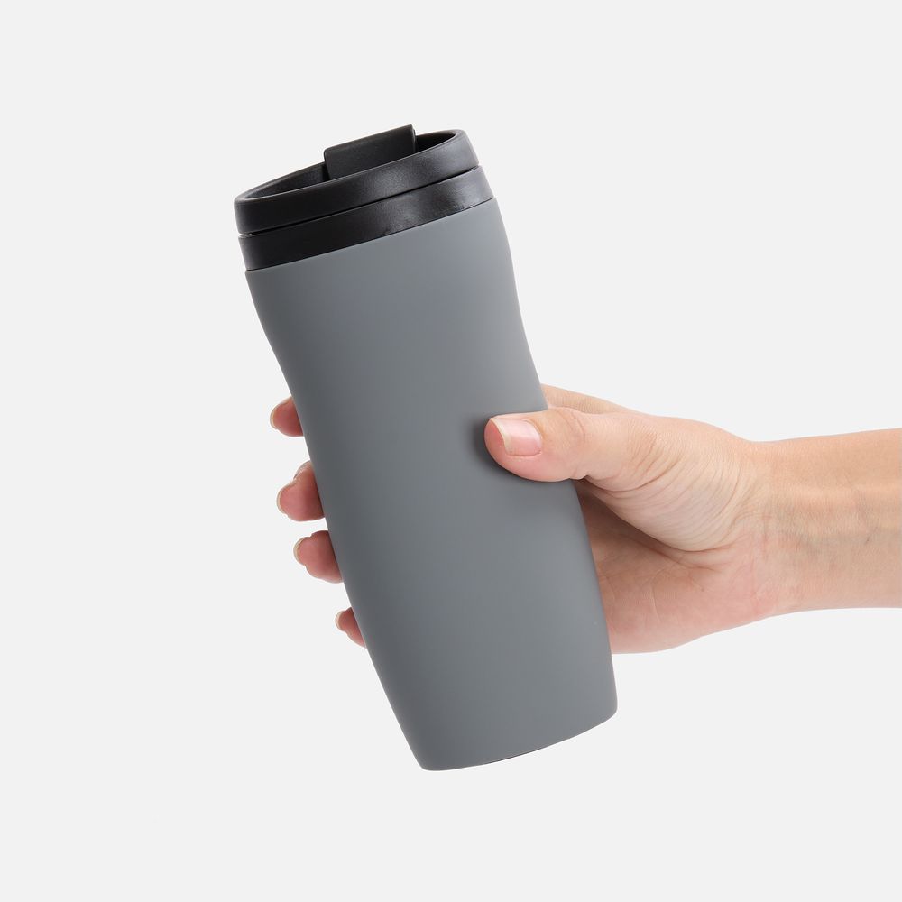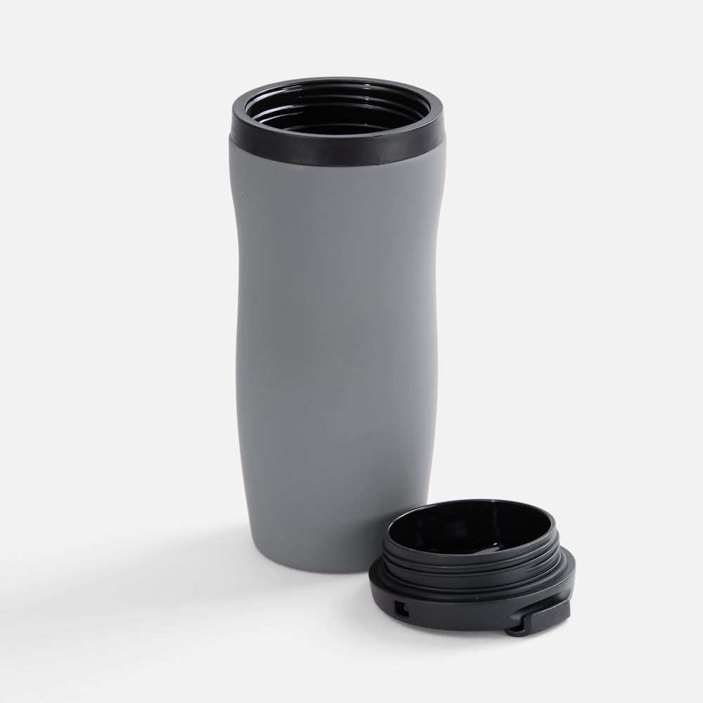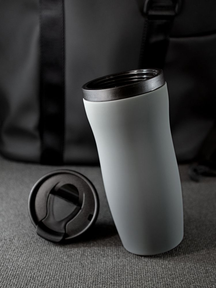 Двухслойная конструкция из нержавеющей стали снаружи и пищевого пластика внутри. Герметичная завинчивающаяся крышка с откидным клапаном для питья. Покрытие софт-тач. В отверстие в крышке можно вставить шнурок для удобного ношения стакана на руке. Шнурок в комплект не входит.