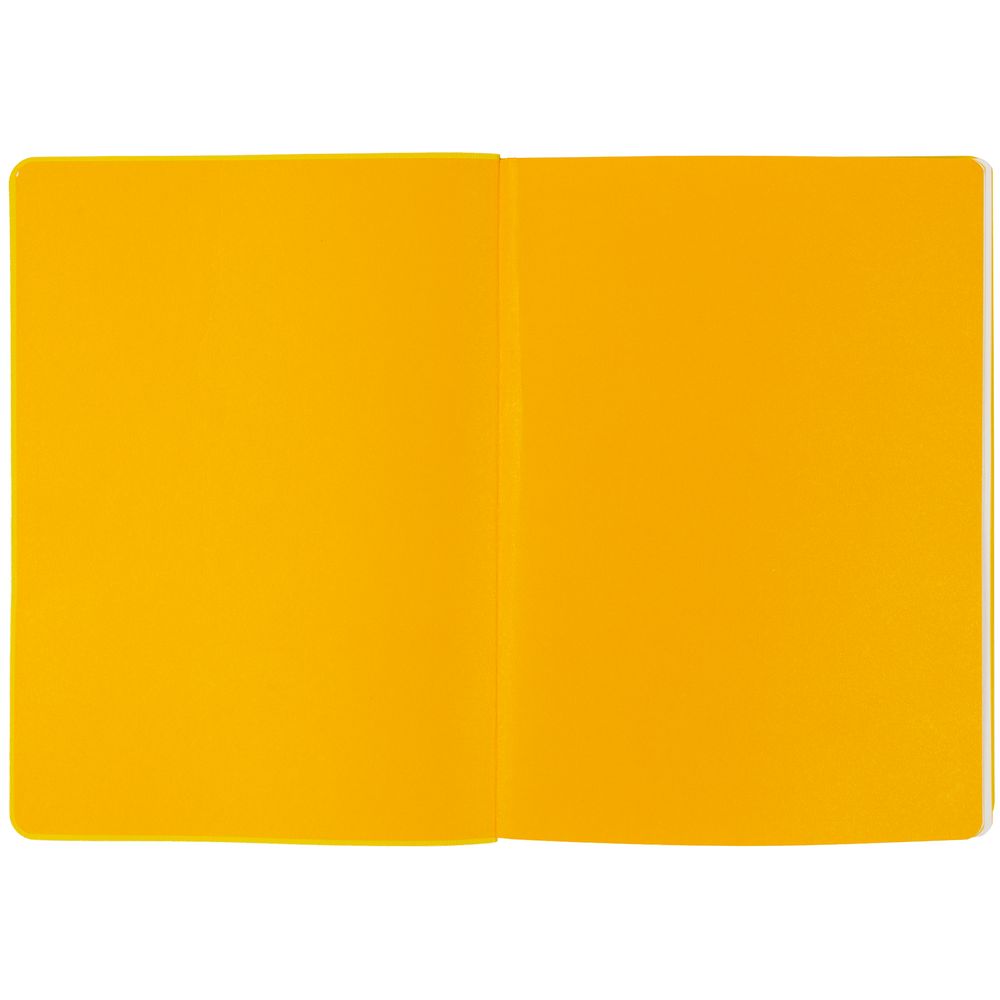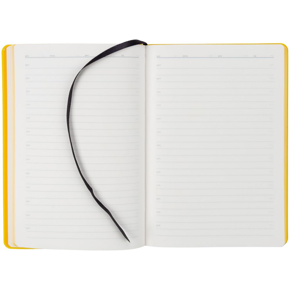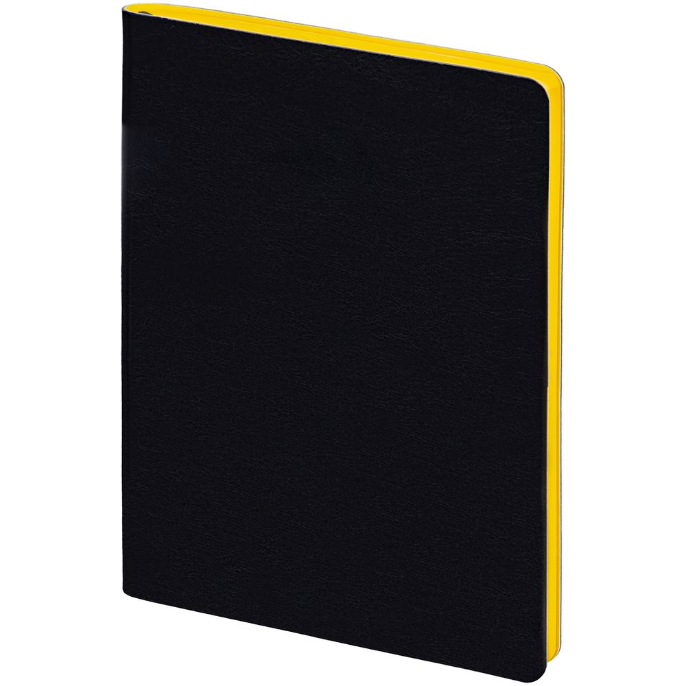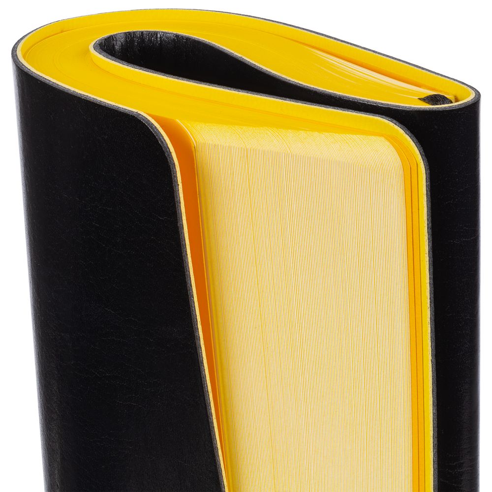 Ежедневник с гибкой обложкой, выполнен из материала Vintage, черный АА и Latte, желтый, дополнен ляссе в цвет обложки.