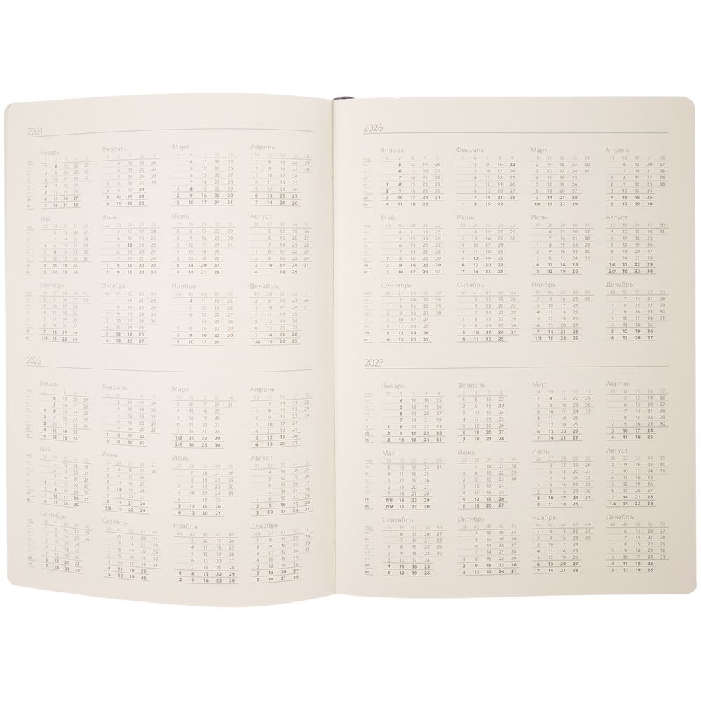 Гибкая обложка ежедневника выполнена из материала Soft Touch Pearl, черный АА и цветного Latte (внутренняя часть обложки).