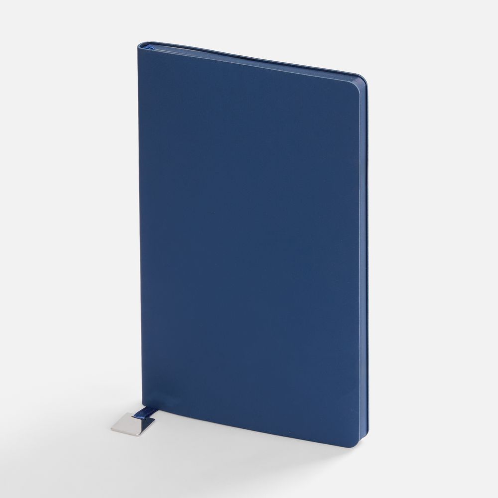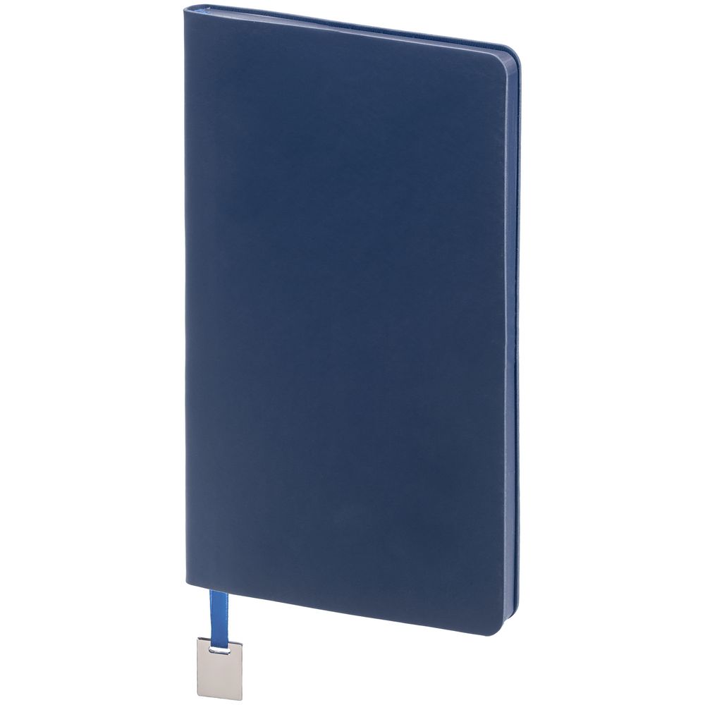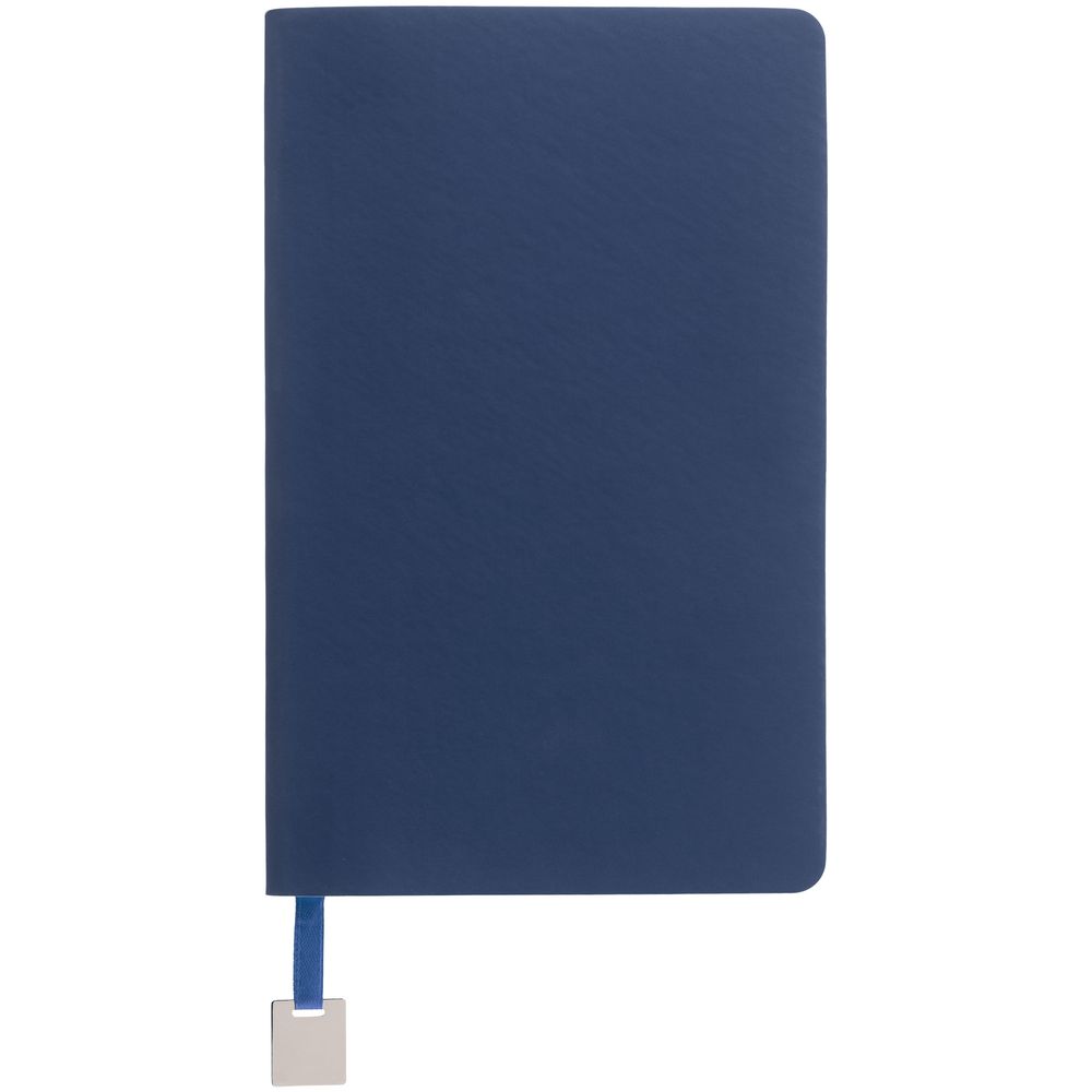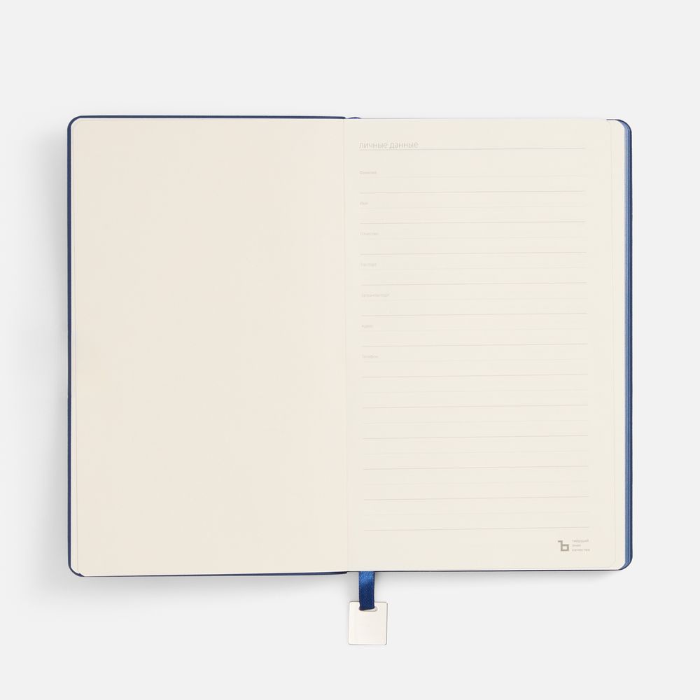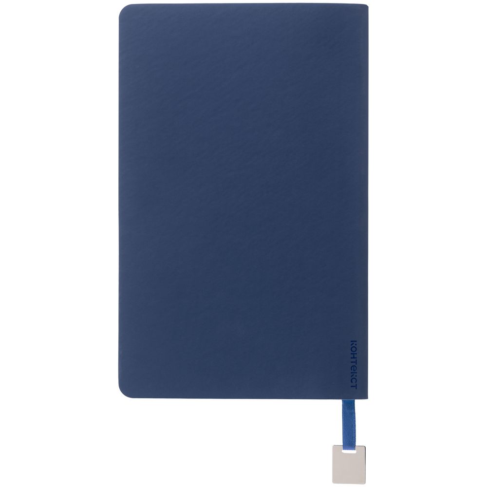 Ежедневник с гибкой обложкой, выполнен из материалов Soft Touch Pearl, синий НН, и Latte, темно-синий (внутренняя часть обложки), дополнен ляссе в цвет обложки с металлическим шильдиком.