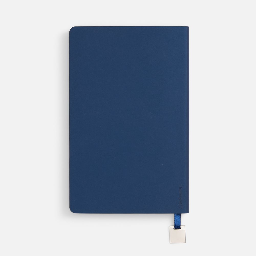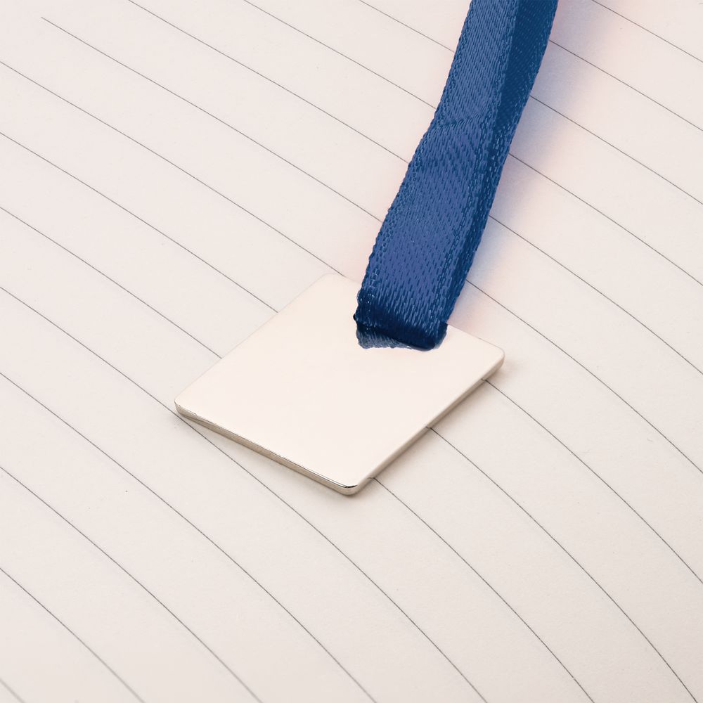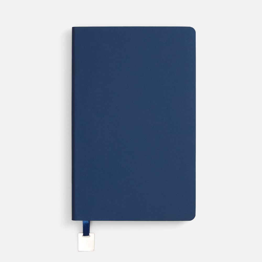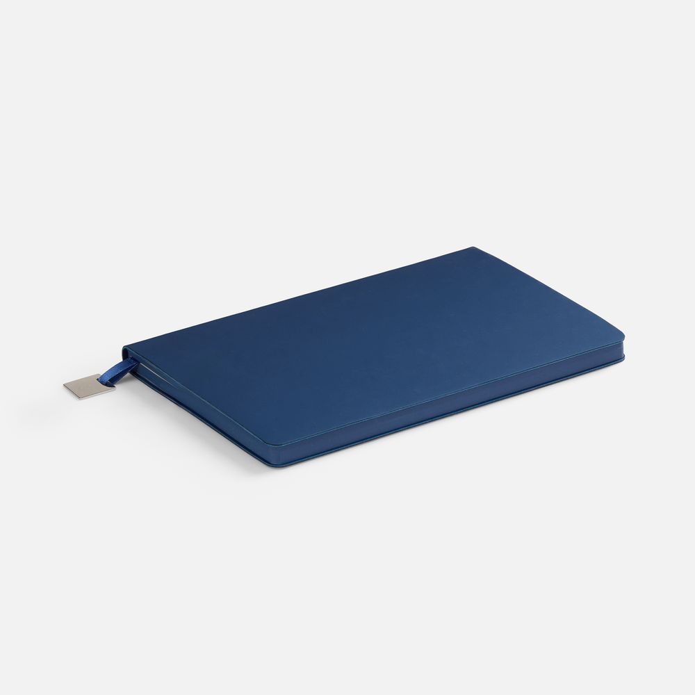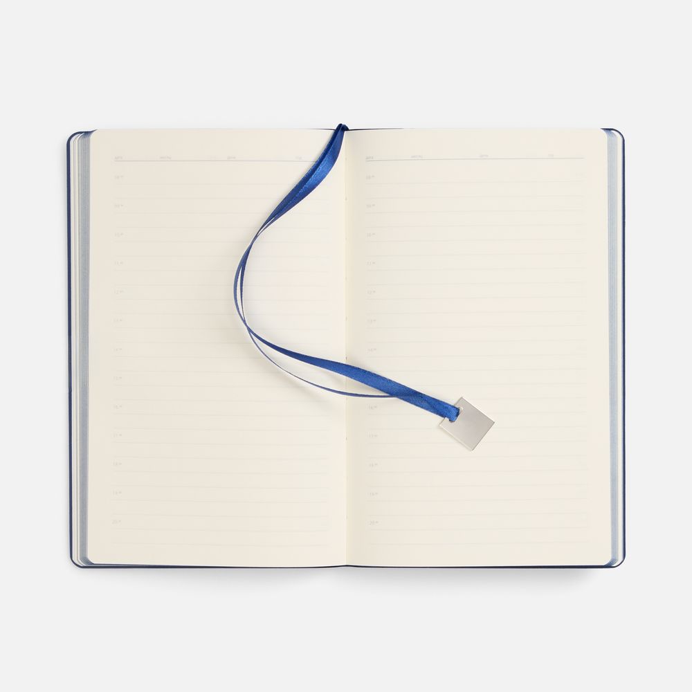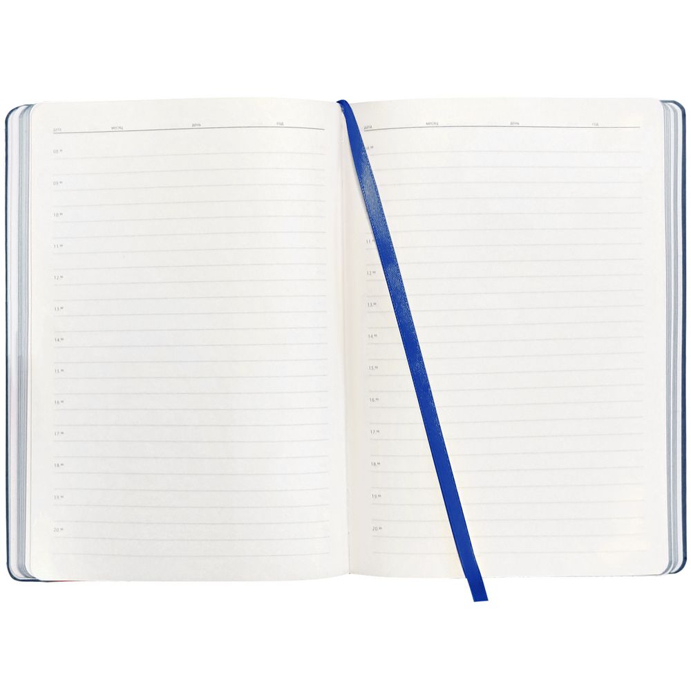 Ежедневник с гибкой обложкой, выполнен из материалов Soft Touch Pearl, синий НН, и Latte, темно-синий (внутренняя часть обложки), дополнен ляссе в цвет обложки с металлическим шильдиком.