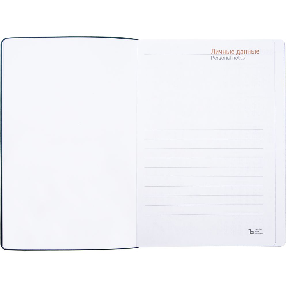 Гибкая обложка ежедневника выполнена из материала Latte, синий НН. Внутри корешка — специальное место для крепления ручки размером до 15х0,9 см.