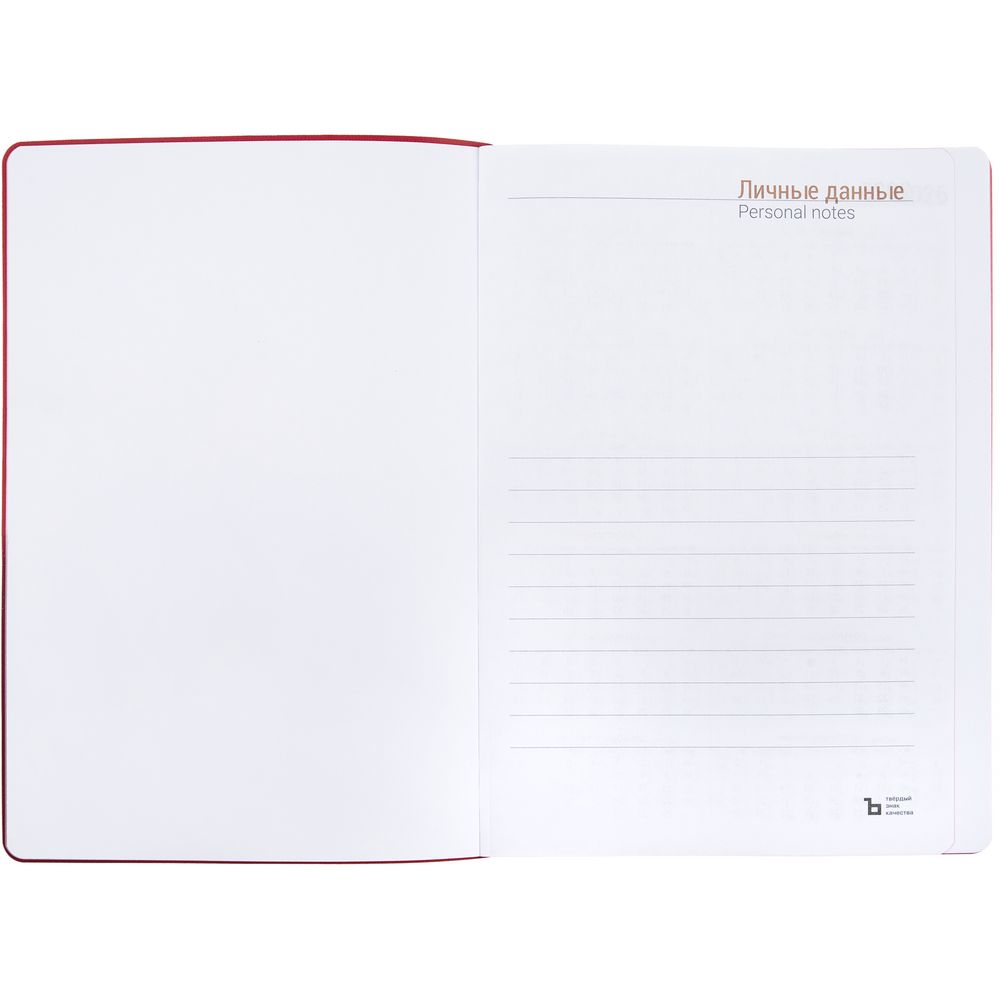 Гибкая обложка ежедневника выполнена из материала Latte, красный РР. Внутри корешка — специальное место для крепления ручки размером до 15х0,9 см.