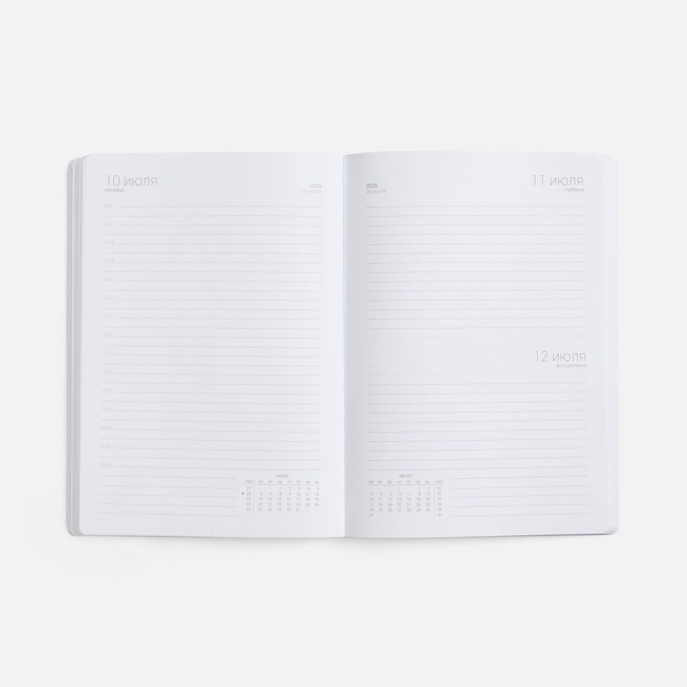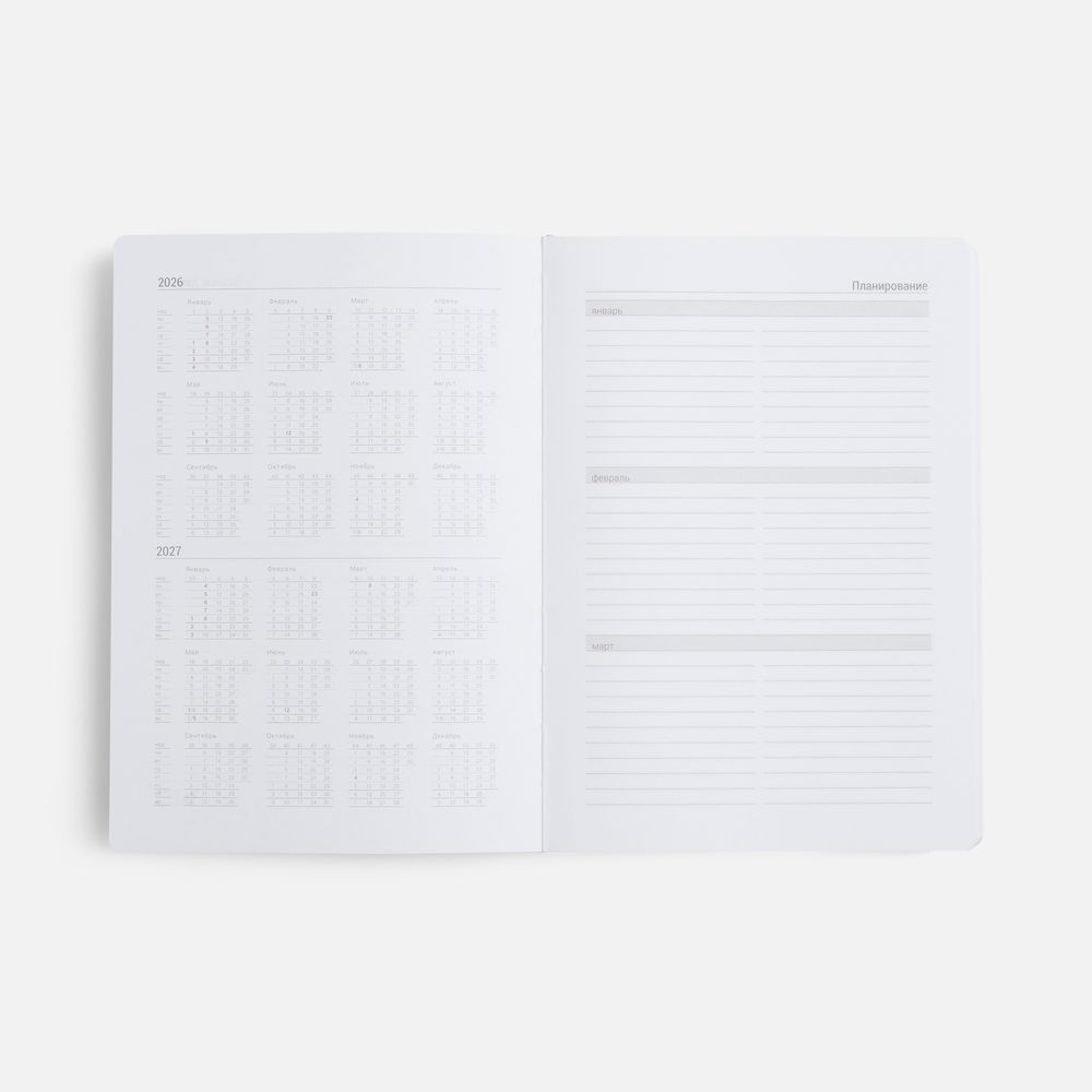 Гибкая обложка ежедневника выполнена из материала Latte, черный АА. Внутри корешка — специальное место для крепления ручки размером до 15х0,9 см.