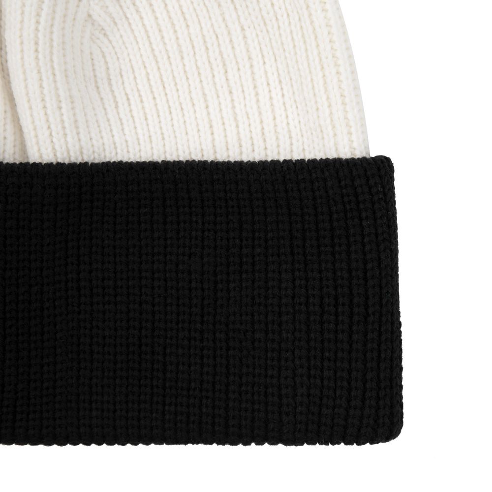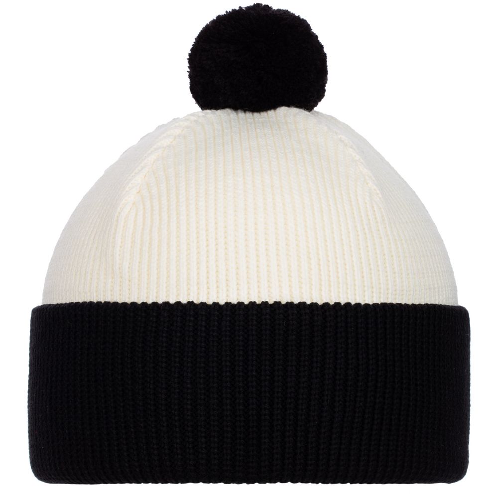 Двуслойная шапка фактурной вязки с контрастным подворотом и помпоном.