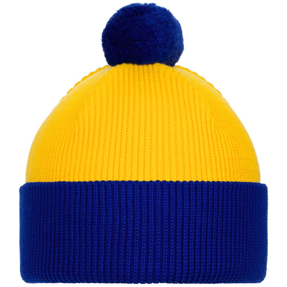 Двуслойная шапка фактурной вязки с контрастным подворотом и помпоном.