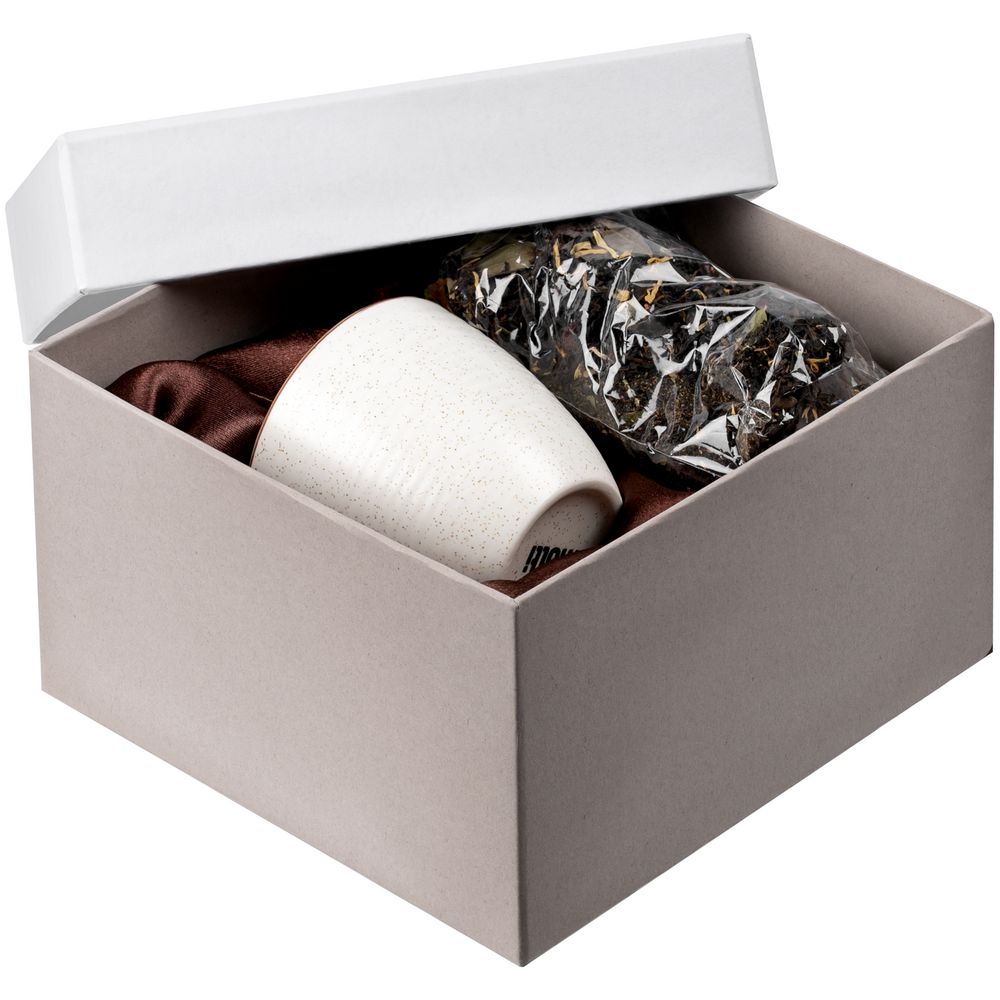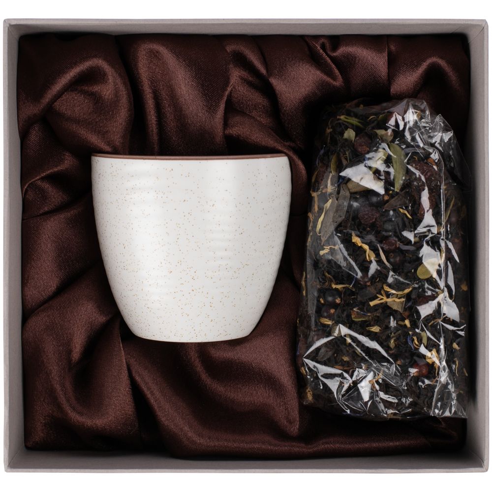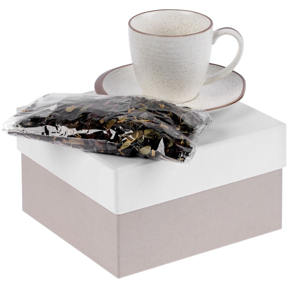В набор входит чайная пара Grainy (емкость чашки 200 мл) и чай «Таежный сбор», 70 г (состав: черный индийский чай, лист брусники, мальва, календула, можжевельник, боярышник, клюква, мята, ароматизирован маслами).