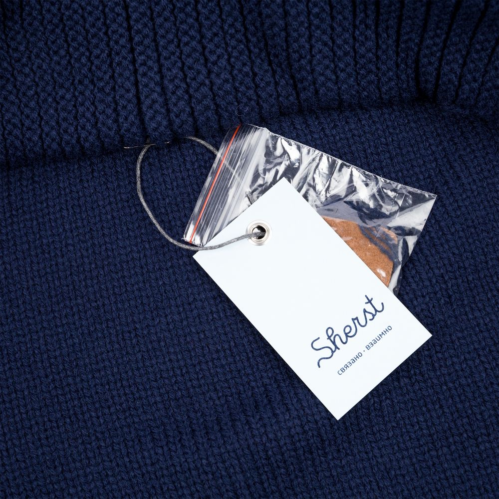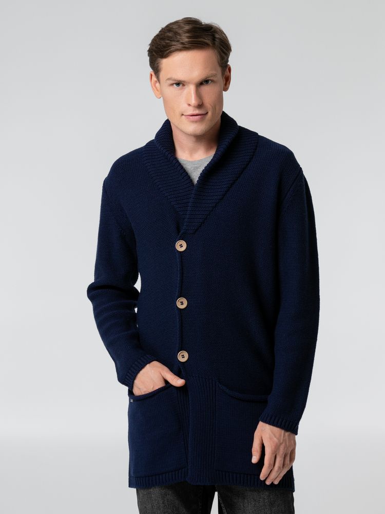 Двухслойный воротник-шалька, цельновязаные карманы, имитирующие накладные, контрастные пуговицы из пластика. Воротник, манжеты и низ изделия выполнены резинкой.
