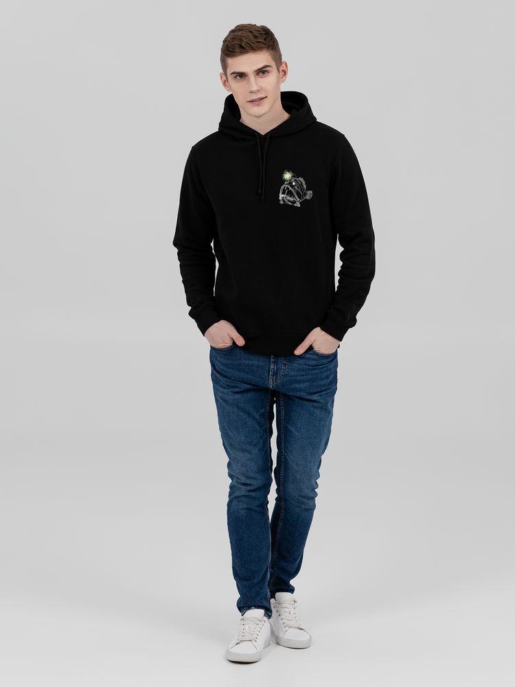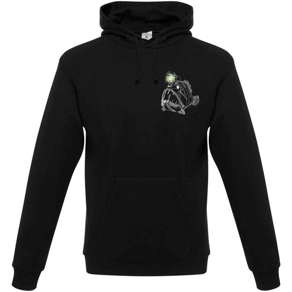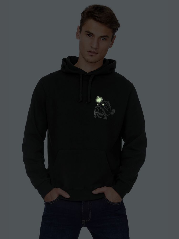 Житель глубин — морской черт — проводит всю жизнь в кромешной темноте под толщею воды. Единственный свет, который он видит, излучает он сам. Биолюминесценция помогает этой рыбе не только ориентироваться в пространстве, но и приманивать добычу. Худи со светящимся в темноте принтом — это путеводитель в тьме будней и магнит, притягивающий нужных людей и удачу!Толстовка без боковых швов с капюшоном.