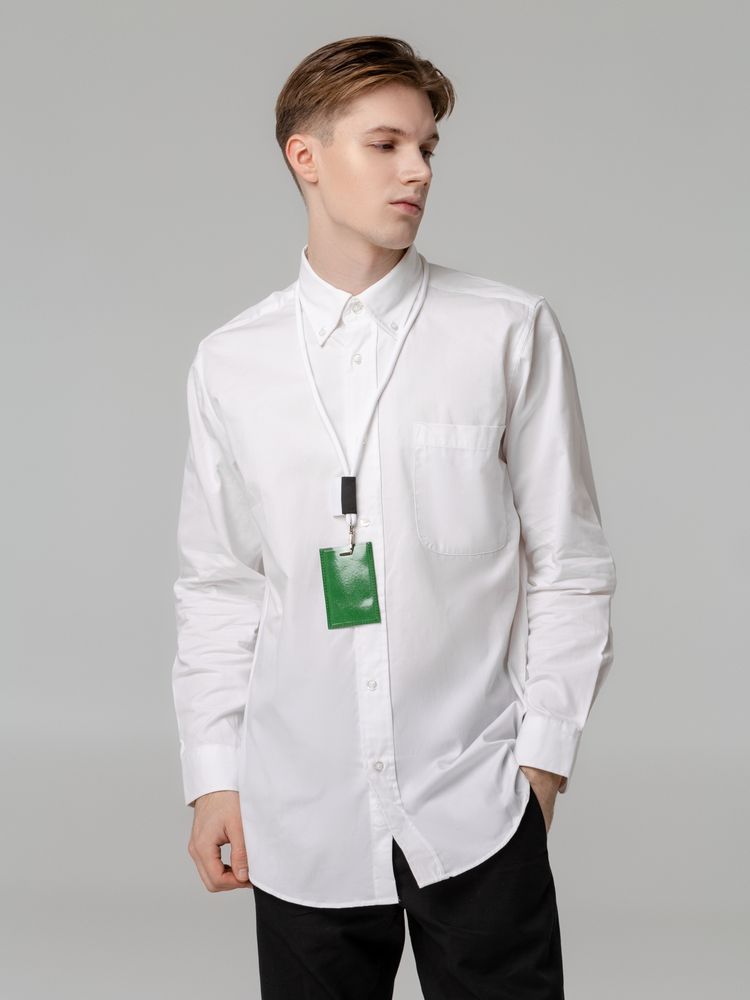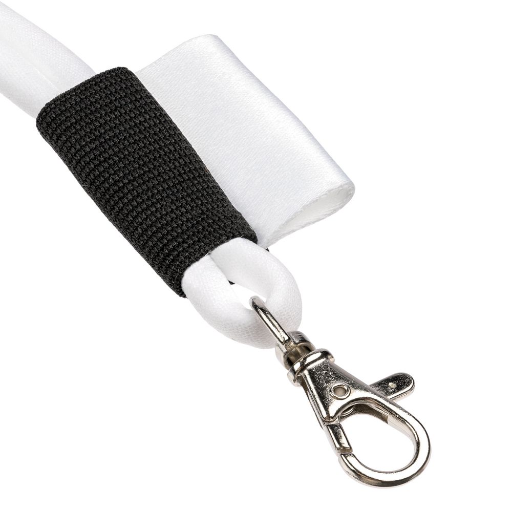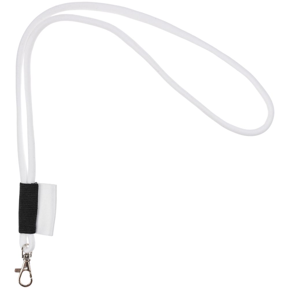 Шнурок дополнен резинкой с биркой под печать и металлическим карабином.