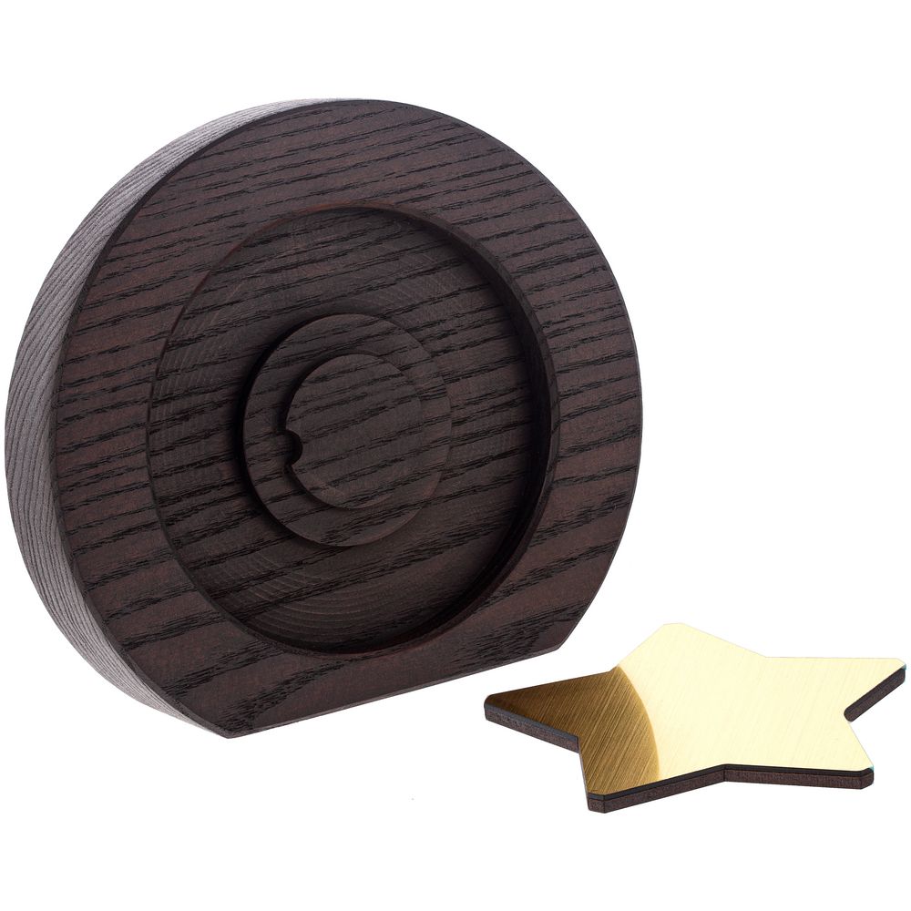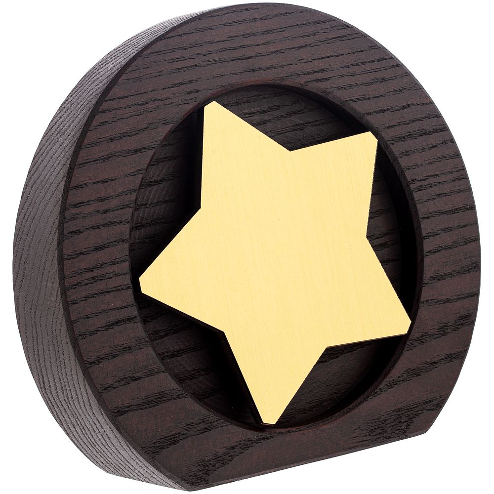 Вставка со звездой из зеркального пластика на деревянной основе крепится на приподнятое основание внутри стелы, что создает объем и многослойность награды. На вставке предусмотрен клеевой слой для крепления после нанесения.