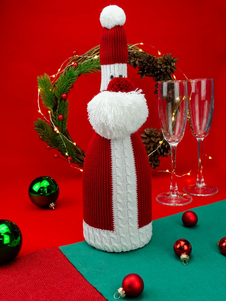 Новогоднее настроение и праздничная атмосфера создаются из деталей, и сервировка главного застолья года — не исключение. Пригласите этого милого вязаного Деда Мороза на стол — и он точно услышит все желания, которые хочется загадать под бой курантов.Чехол для бутылки шампанского поставляется в пакете с липким краем.