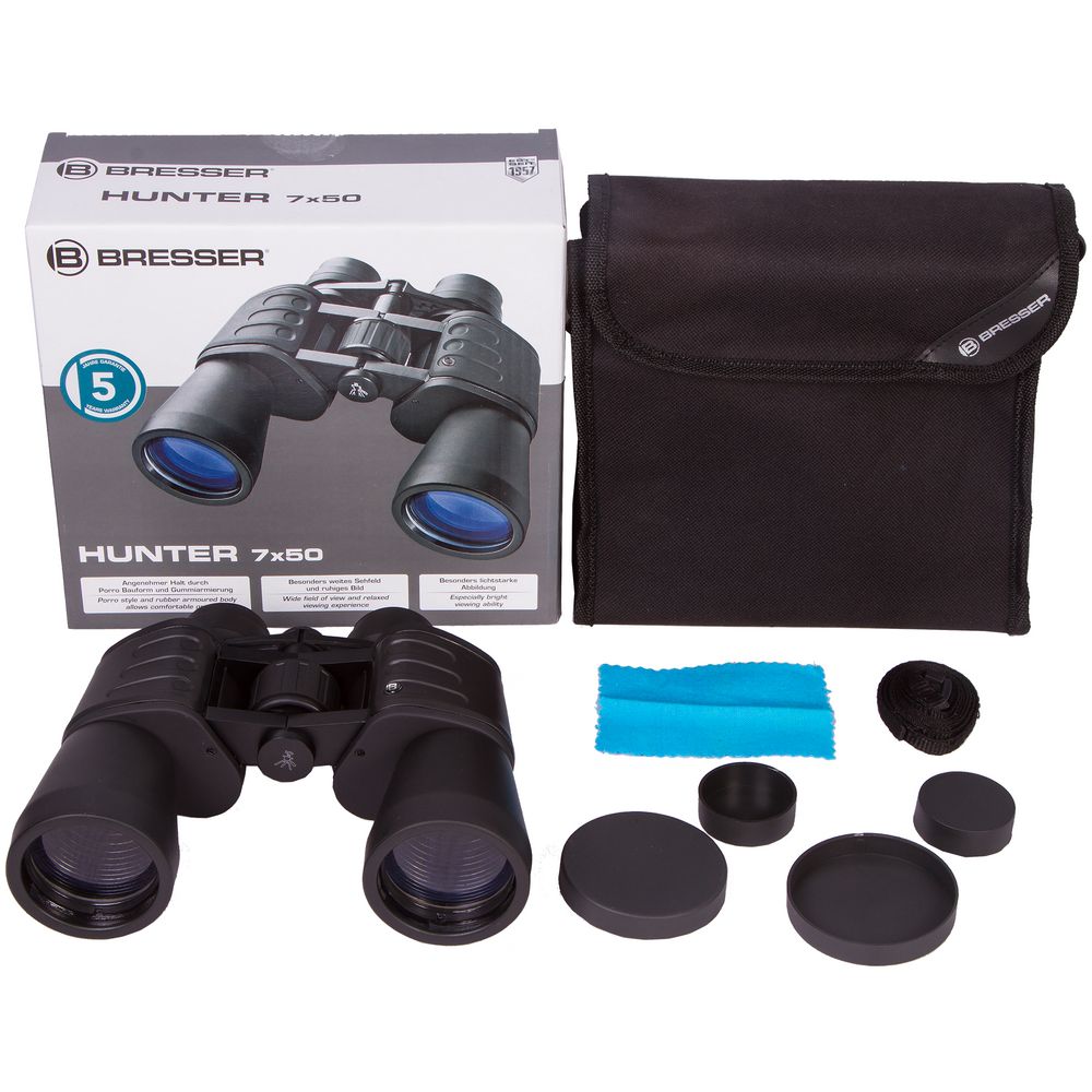 Бинокль создан на базе классической системы призм Порро, сделанных из стекла BK-7 с многослойным просветлением. Увеличение — 7x, диаметр объективов — 50 мм. Минимальное фокусное расстояние — 5 м. Бинокль имеет функцию подстройки межзрачкового расстояния и диоптрийной коррекции окуляров. Встроенная система центральной фокусировки позволит быстро настроить резкость.В комплект входит чехол из полиэстера.