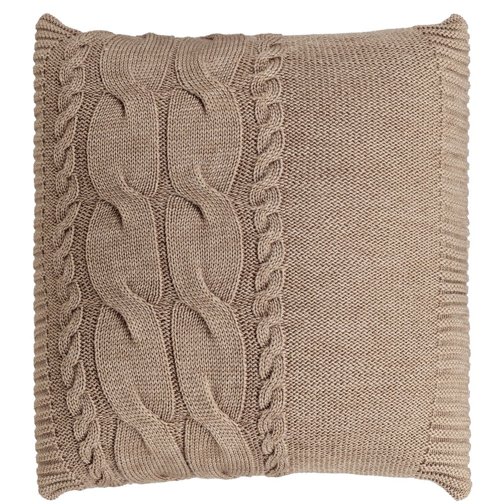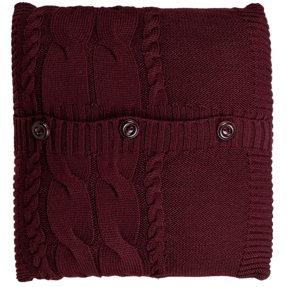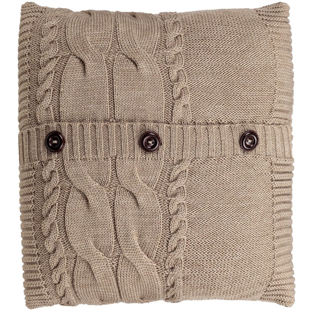 Вязаная наволочка надевается на подушку из спанбонда, наполнитель — синтепон. Наволочка крепится на три пуговицы.