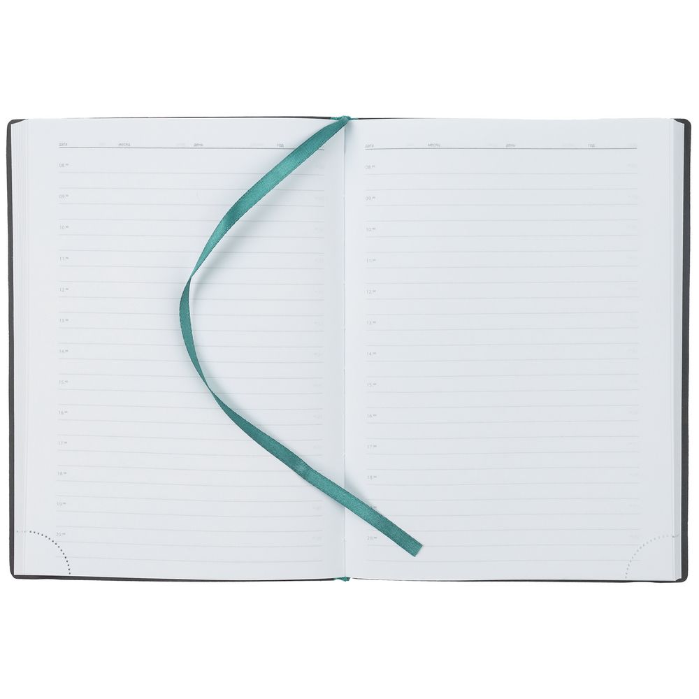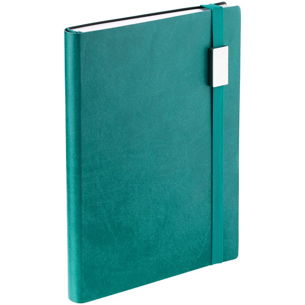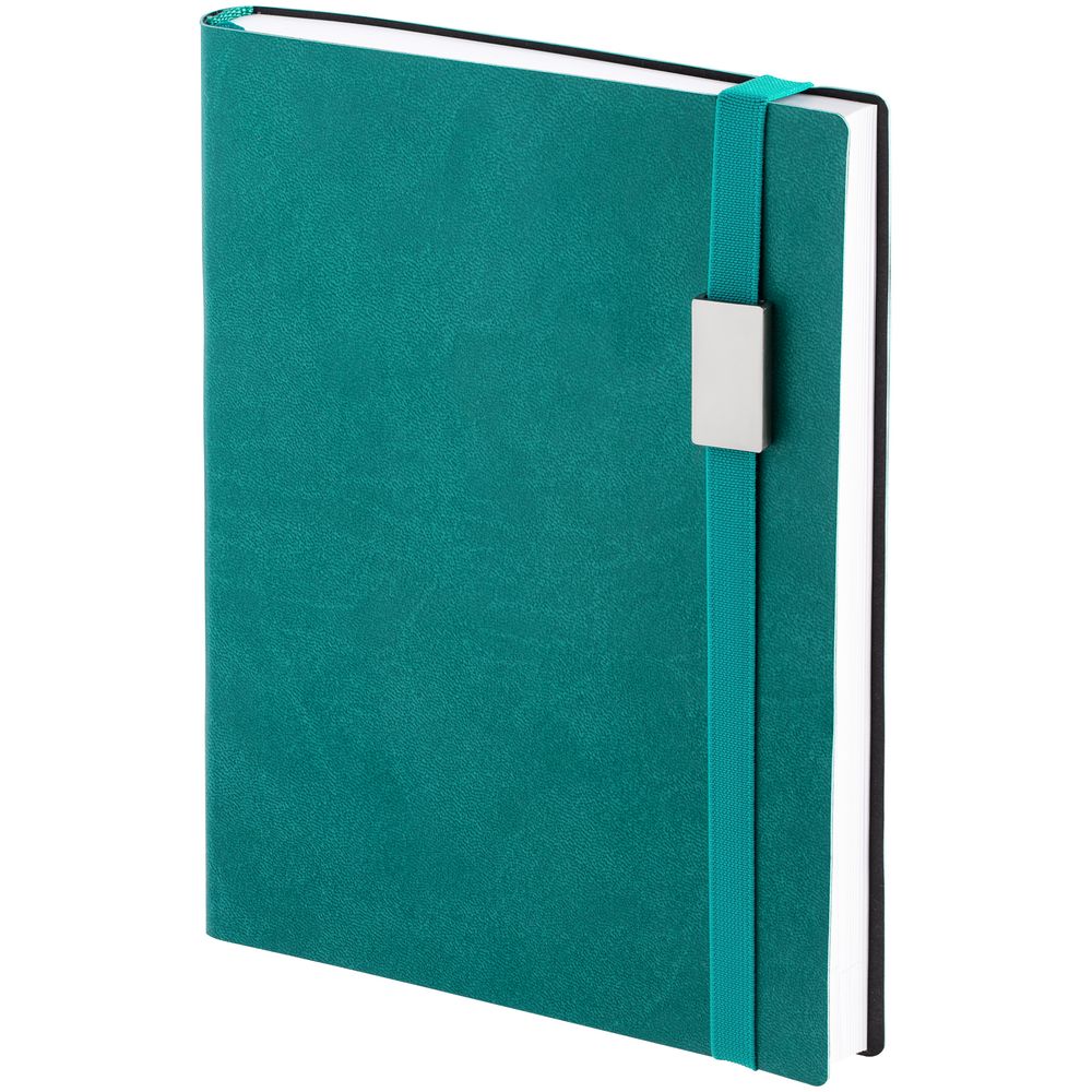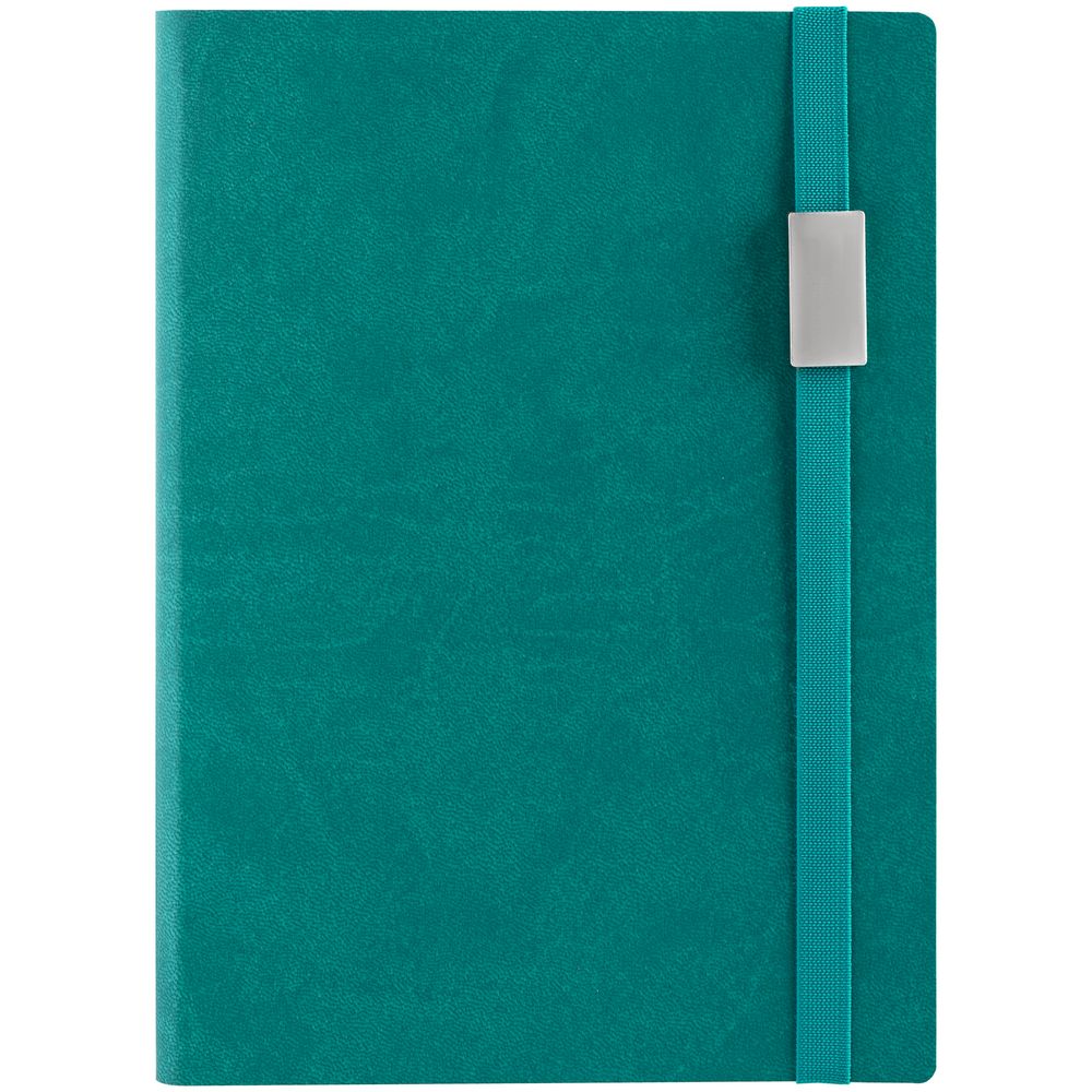 Ежедневник с гибкой обложкой выполнен из материала Brand, морская волна II, и дополнен резинкой шириной 1 см с металлическим шильдом, капталом и ляссе в цвет обложки.