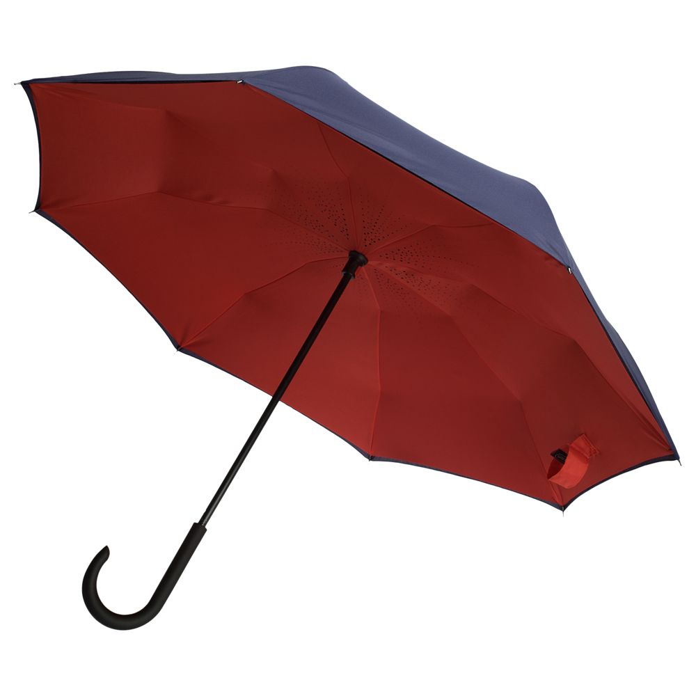 Это зонт-наоборот, зонт-наизнанку. Складываясь после дождя, он прячет мокрую поверхность в себя, а сухая остается снаружи. Для просушки его можно не только подвесить за ручку, как обычные зонты, но и поставить прямо на пол в полусложенном состоянии. Итог — мягкая щадящая просушка и минимум занятого мокрым зонтиком места.