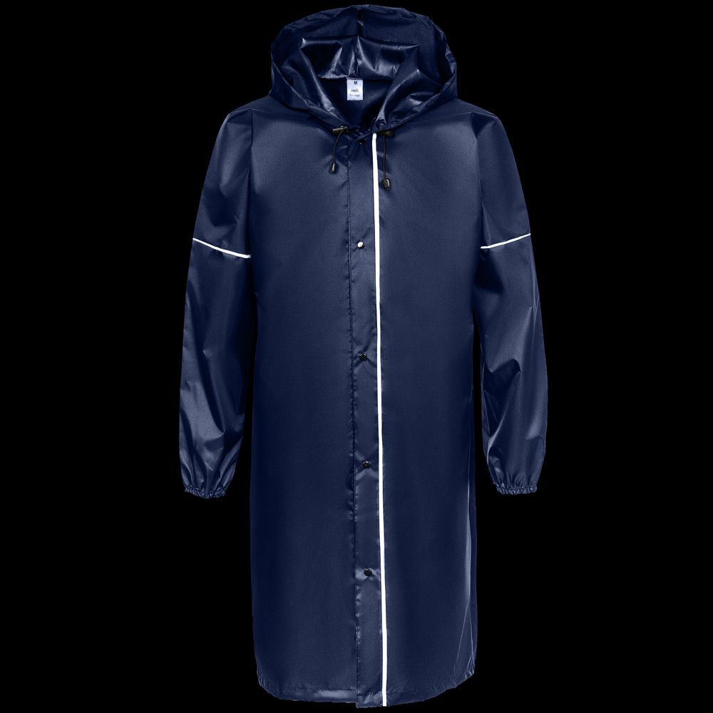 Плащ-дождевик из ткани оксфорд на кнопках с капюшоном. Световозвращающие элементы на рукавах и планке позволяют быть замеченным в темное время суток.