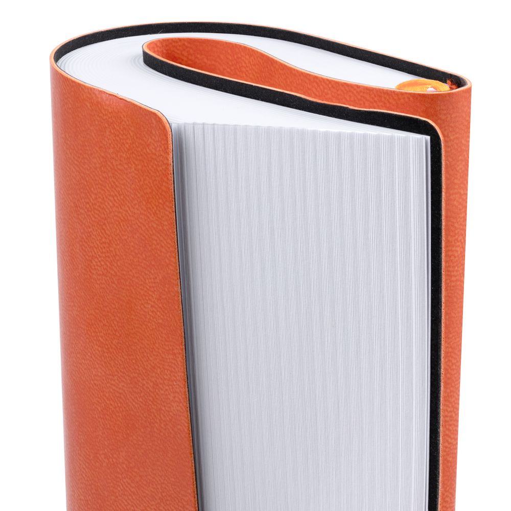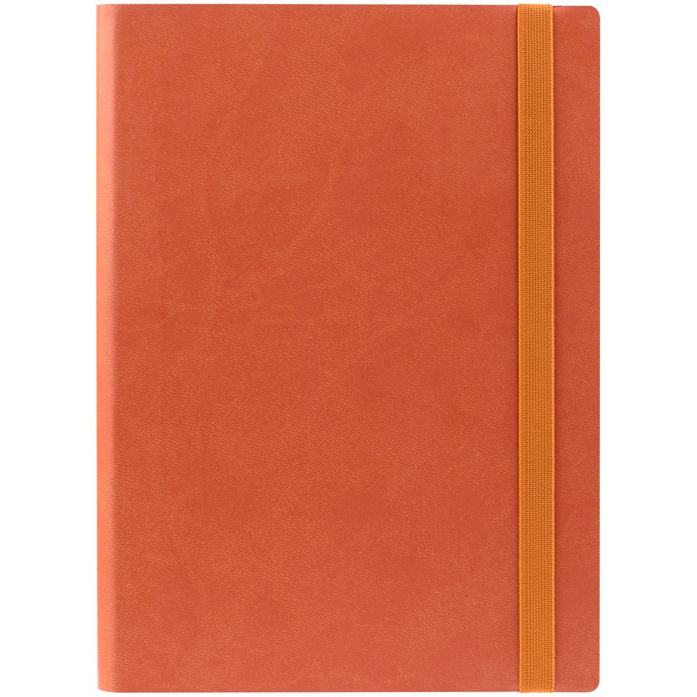 Ежедневник с гибкой обложкой выполнен из материала Brand, оранжевый ОО, и дополнен резинкой шириной 1 см, капталом и ляссе оранжевого цвета.