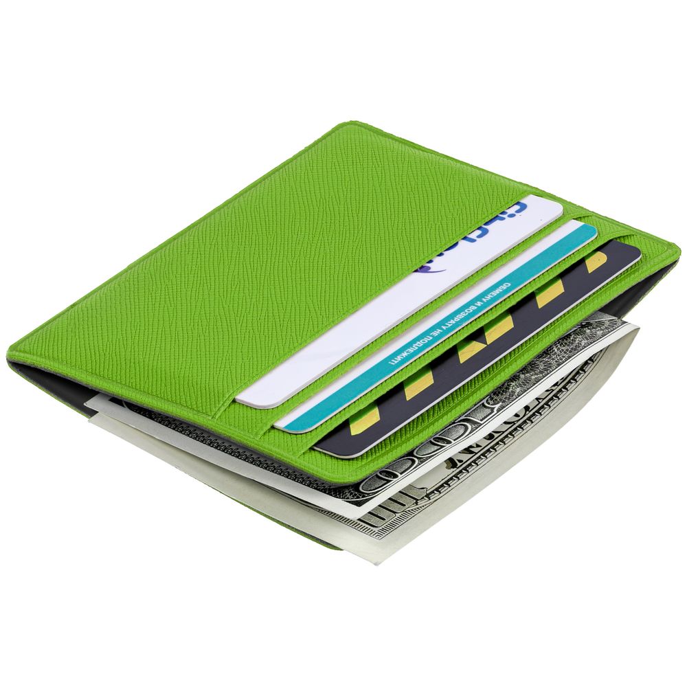 Чехол для карточек из искусственного материала, имитирующего сафьяновую кожу, с шестью отделениями для кредитных карт и одним — для сложенных купюр.
