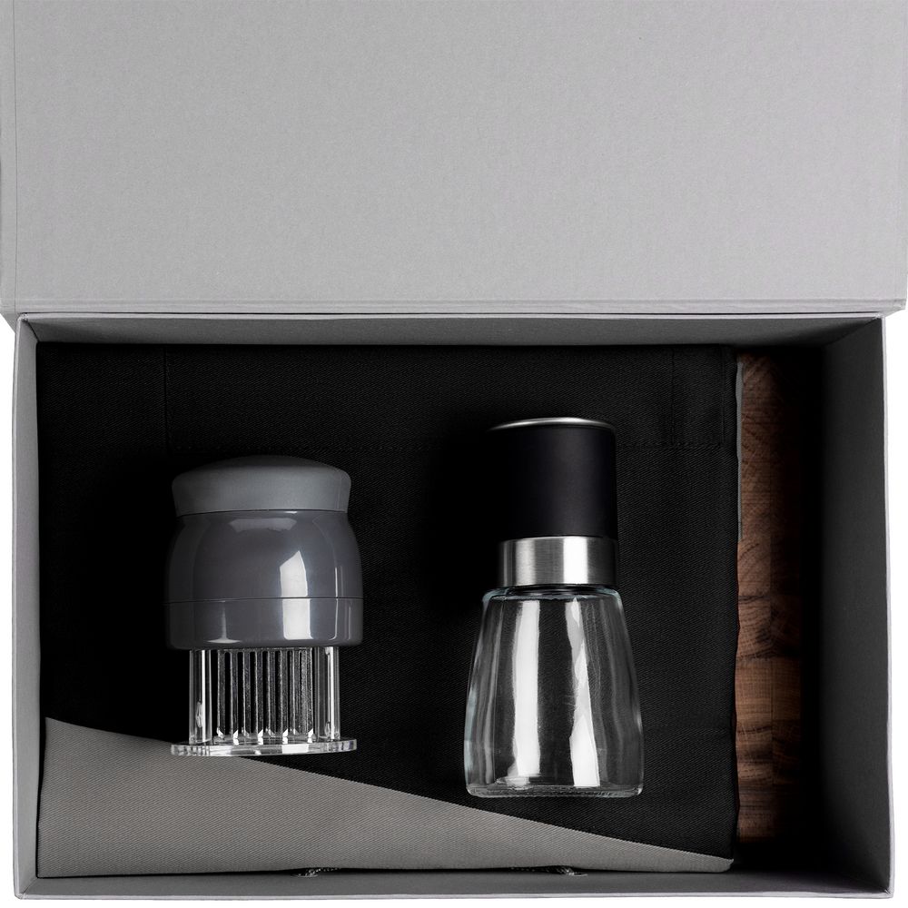 Премиум-комплект для приготовления сочных мясных блюд — торцевая разделочная доска, мельница для специй, тендерайзер и фартук оригинальной формы. Осторожно: набор пробуждает внутреннего кулинарного шефа даже из самой глубокой спячки, а домашнюю кухню превращает в истинный стейкхаус.