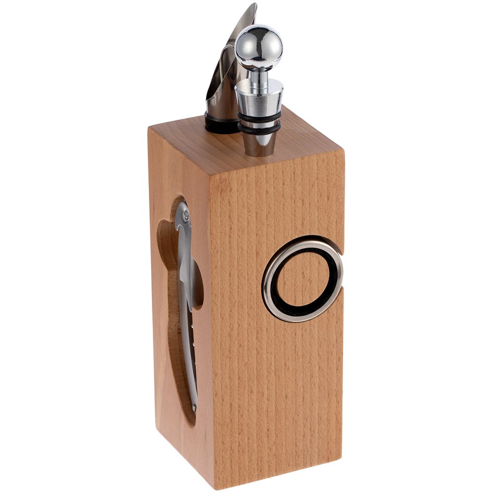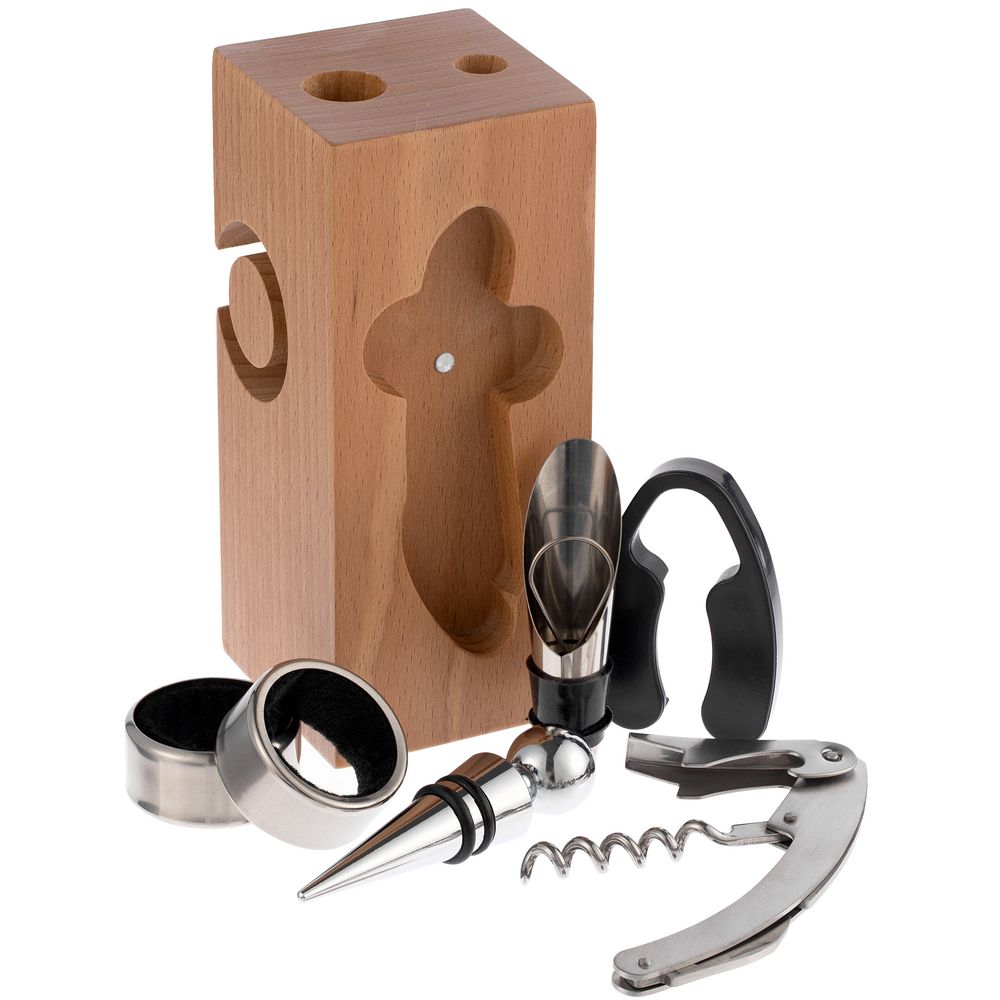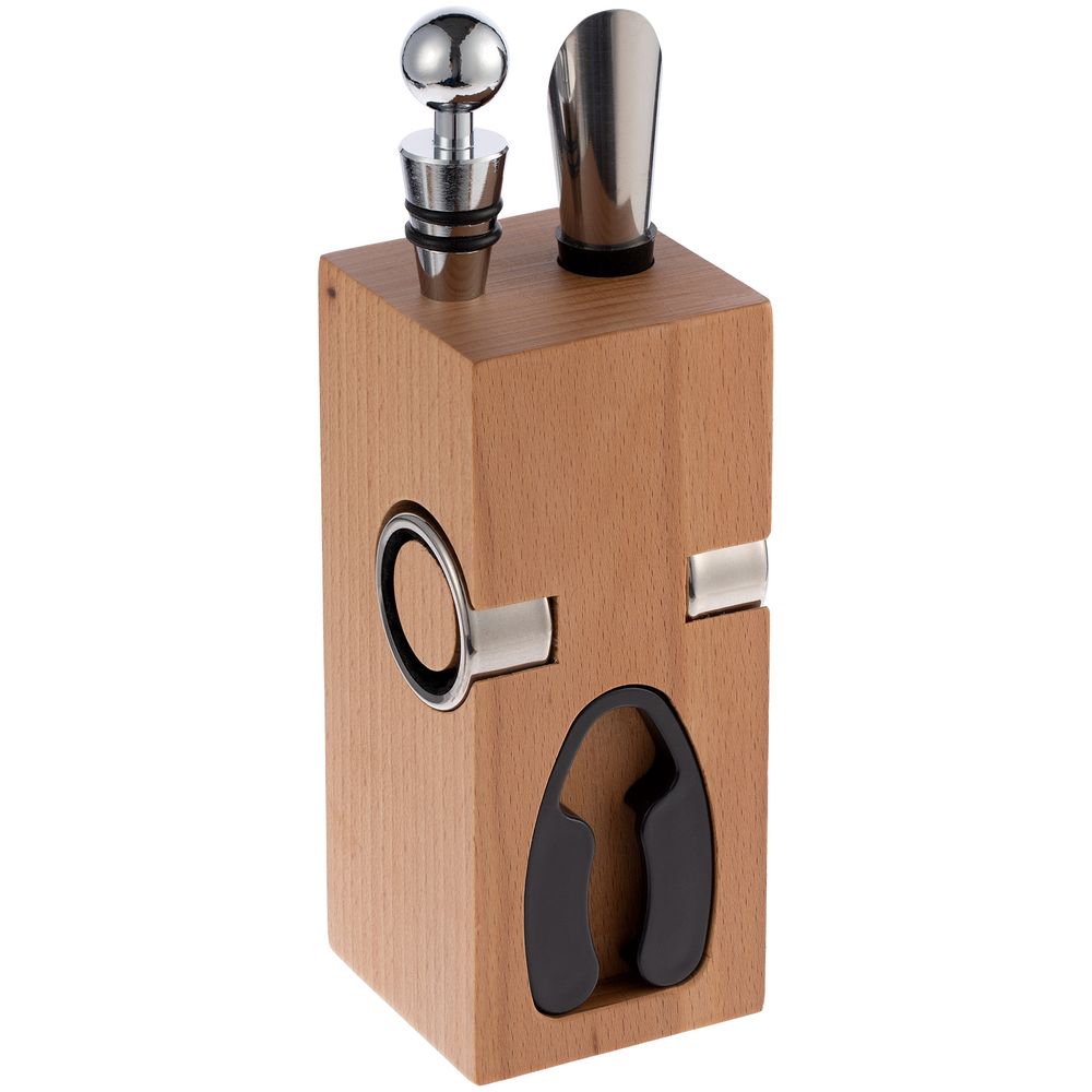 подставка - дерево, бук; штопор - нержавеющая сталь; каплеуловитель - нержавеющая сталь; аэратор - нержавеющая сталь, силикон; пробка - нержавеющая сталь, силикон; нож для фольги - пластик, нержавеющая сталь