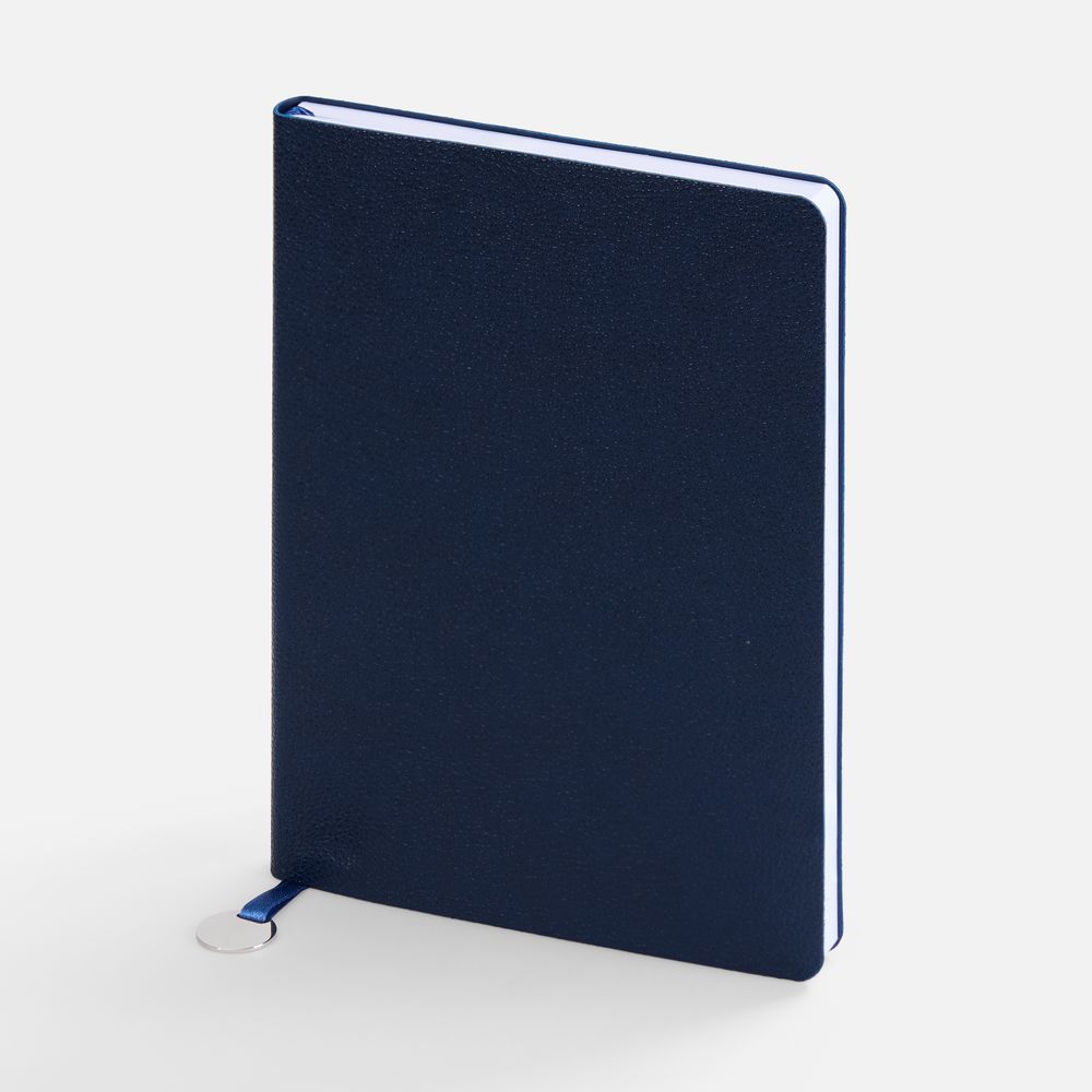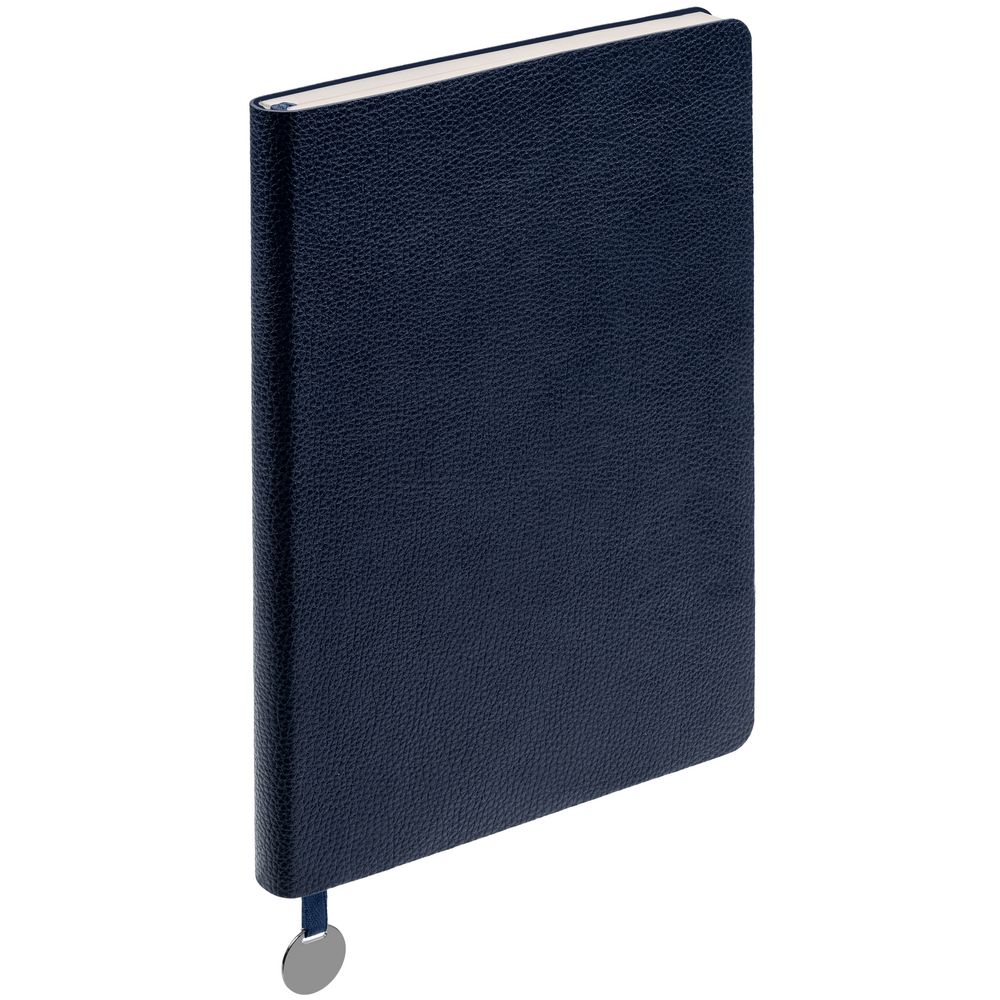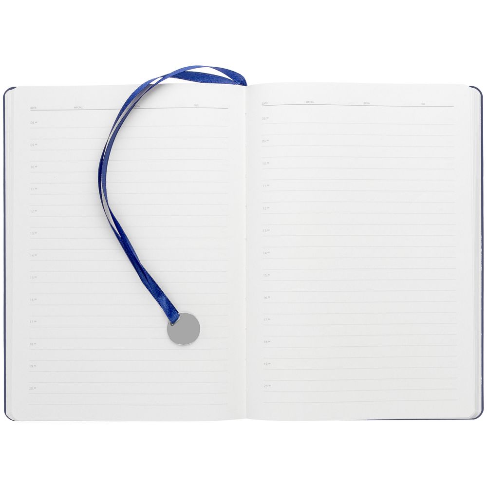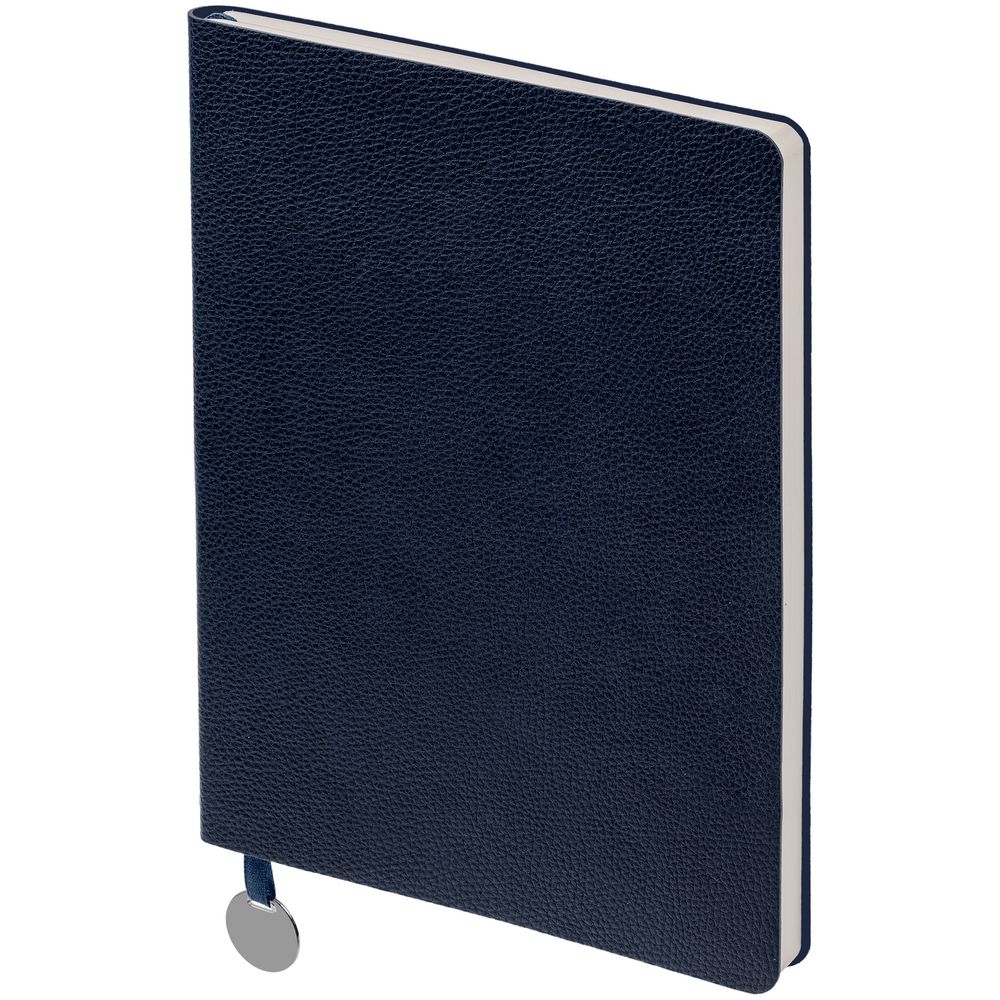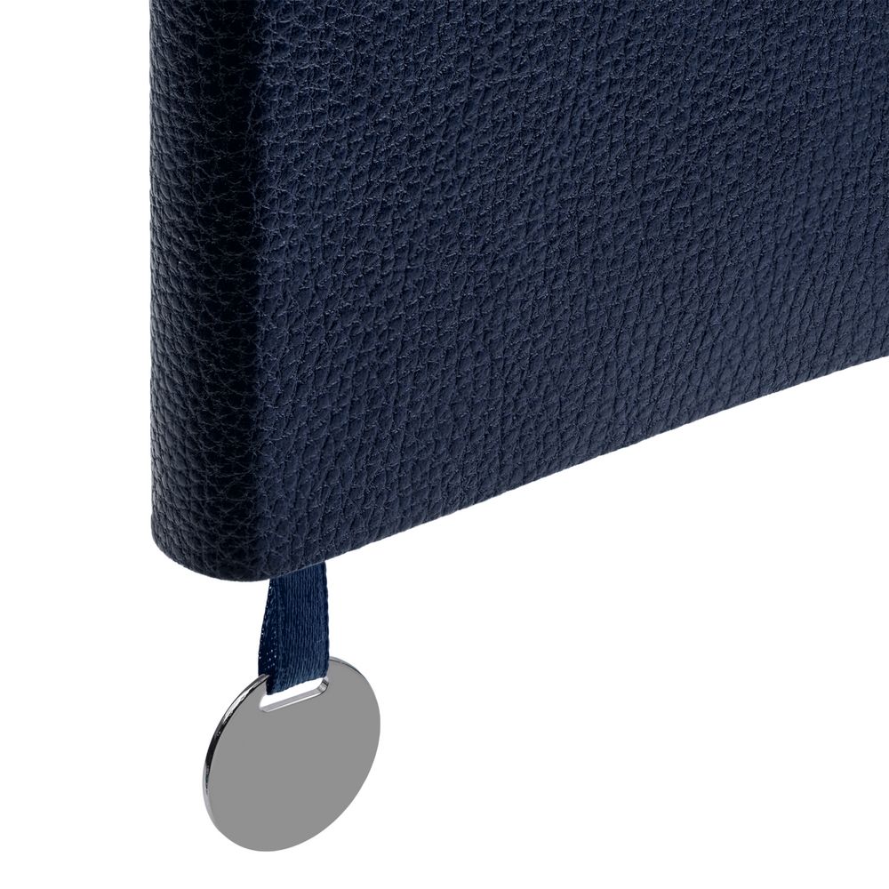 Ежедневник с гибкой обложкой, выполнен из материал La Fite, темно-синий ХХ, дополнен ляссе в цвет обложки с металлическим шильдом.