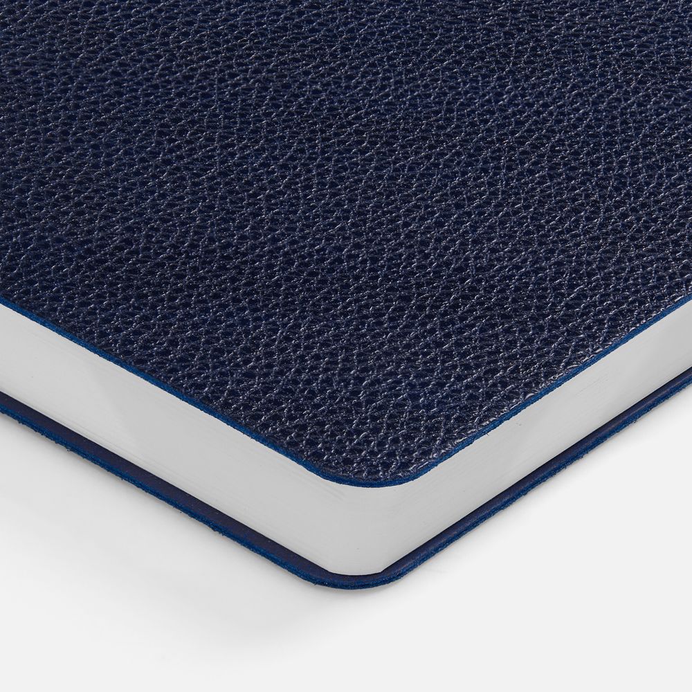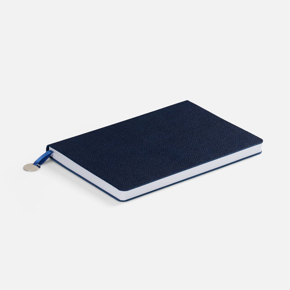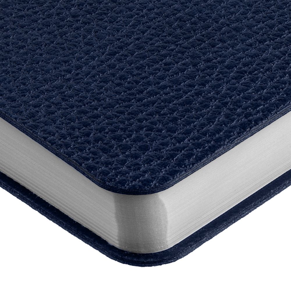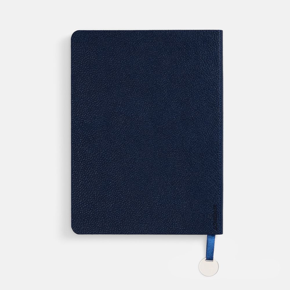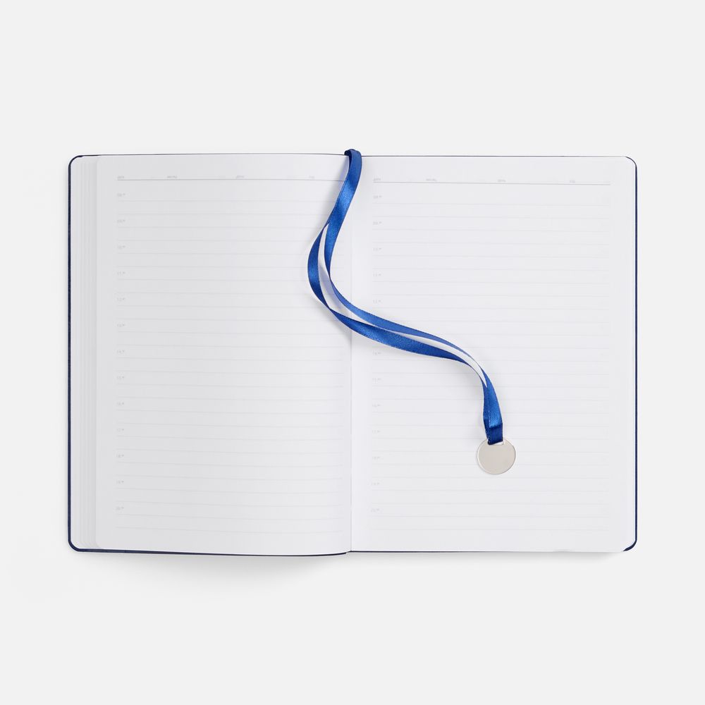 Ежедневник с гибкой обложкой, выполнен из материал La Fite, темно-синий ХХ, дополнен ляссе в цвет обложки с металлическим шильдом.