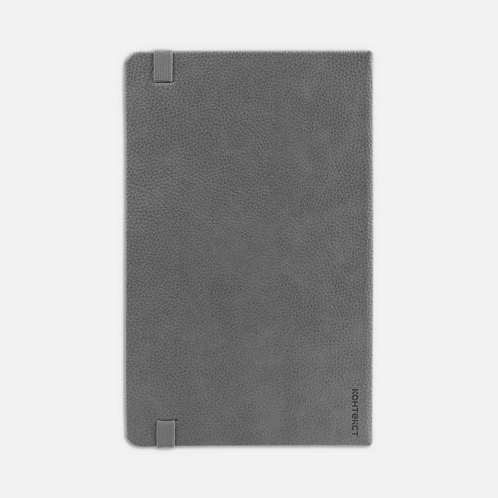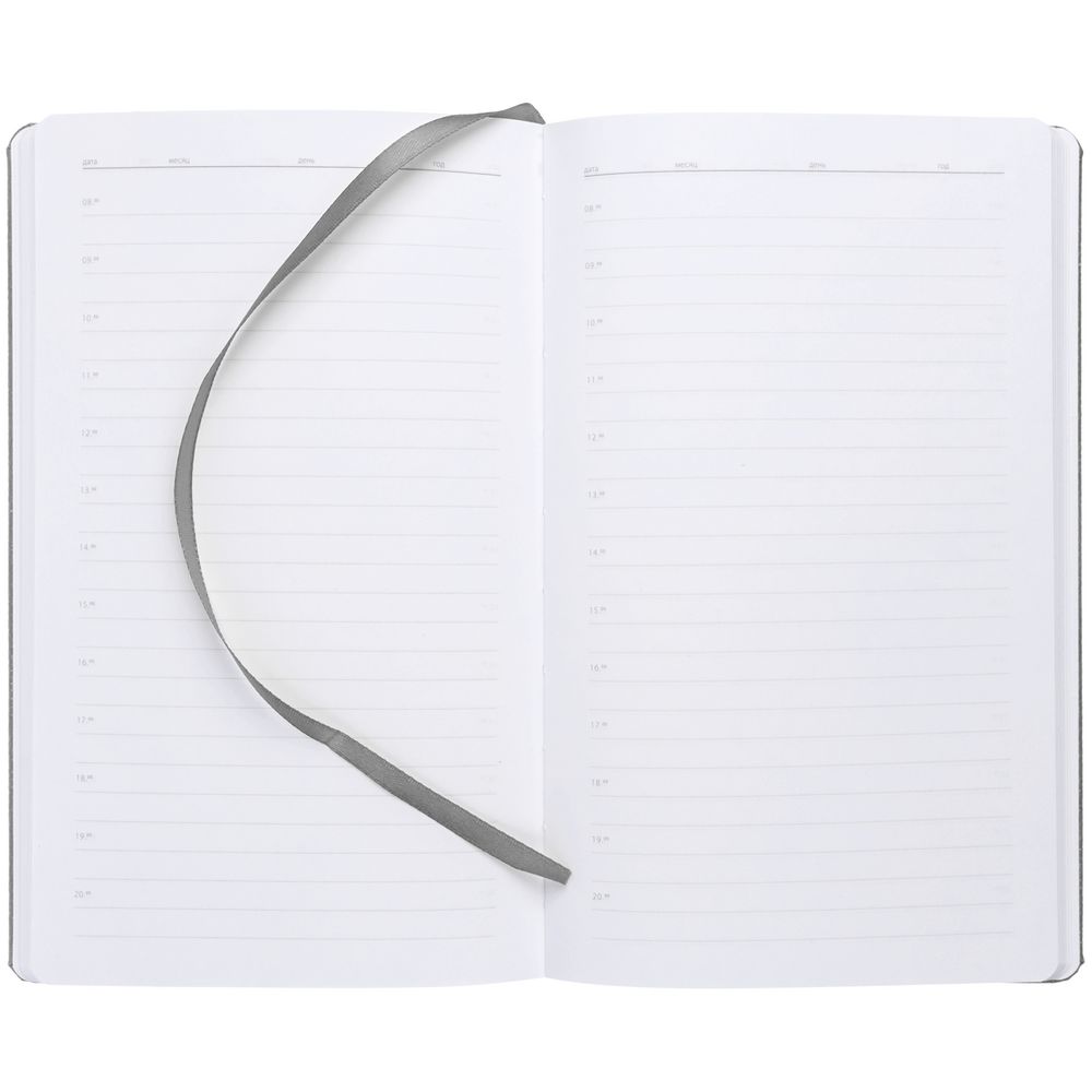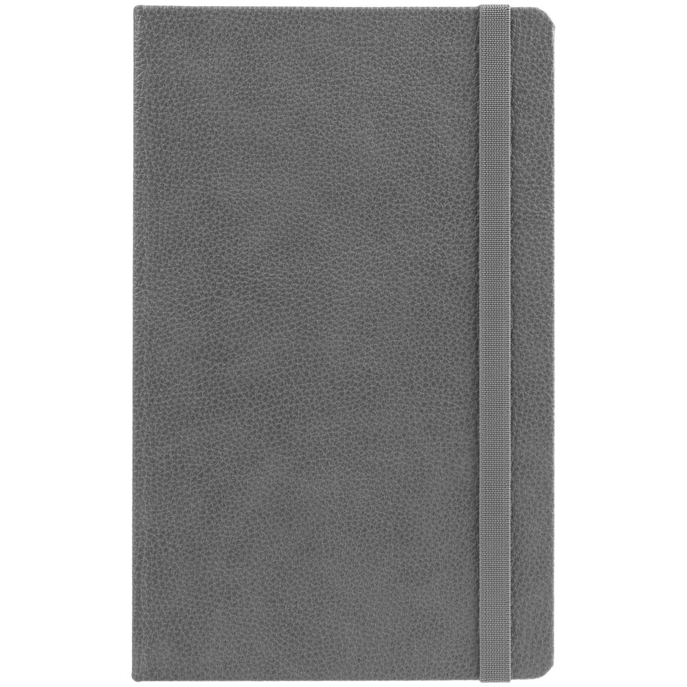 Ежедневник с твердой обложкой, выполнен из материала LaFite, серый СС, дополнен резинкой и ляссе в цвет обложки.