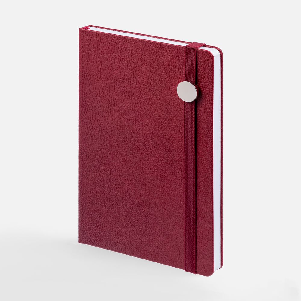Зауженный ежедневник с круглым металлическим шильдом на резинке.