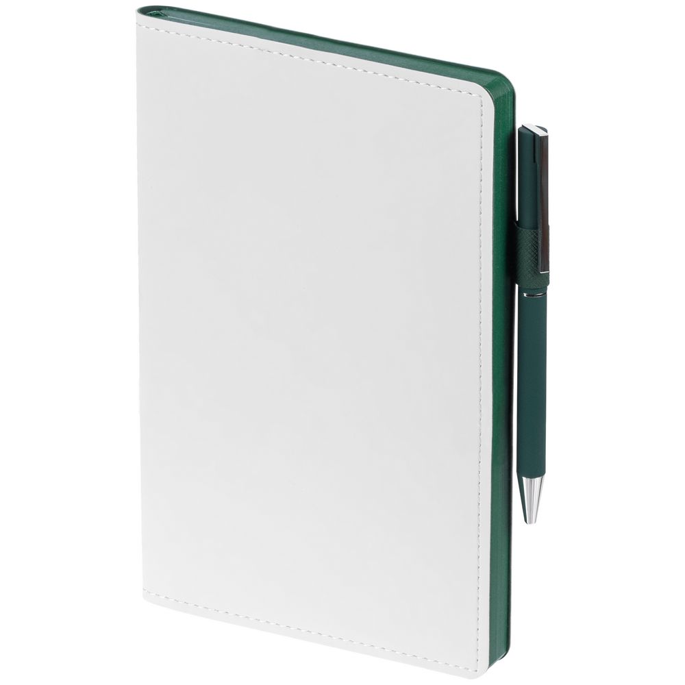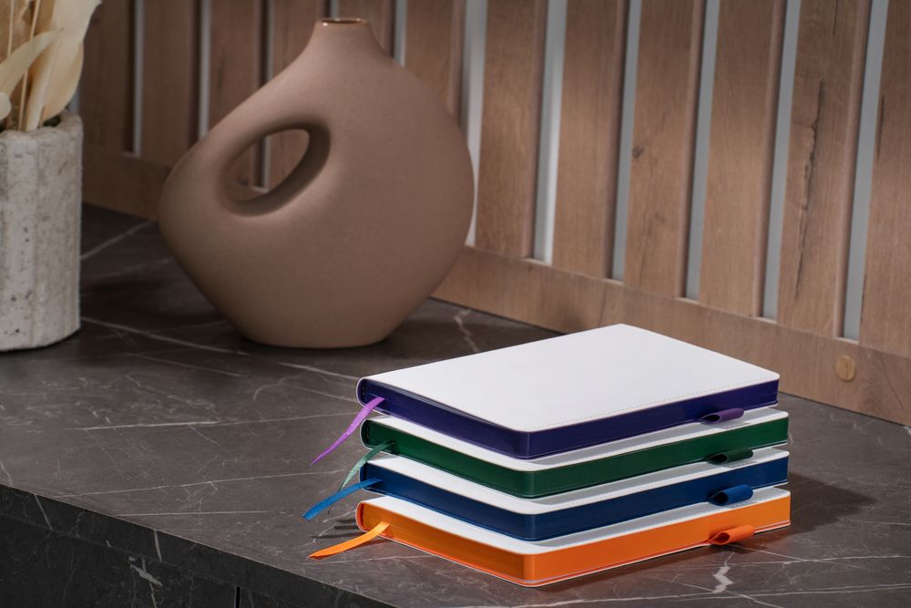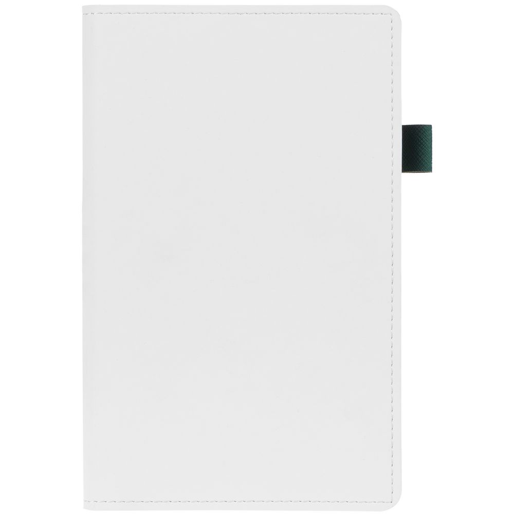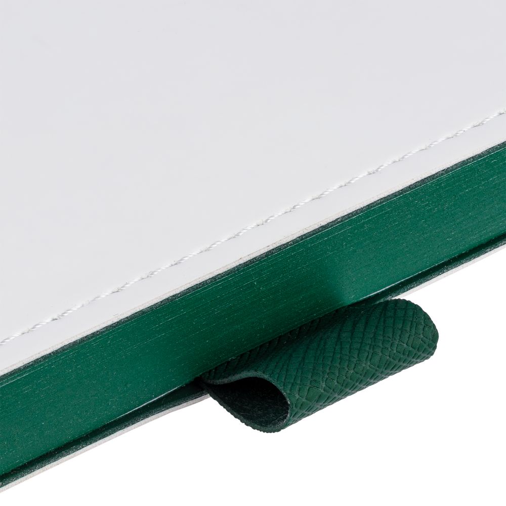 Гибкая обложка, материал обложки — Soft Touch, белый BB и зеленый FF; материал петли для ручки — Nice Touch, зеленый FF.